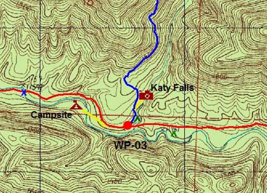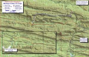 The Buckeye and Caney Creek Trails are located in the Caney Creek Wilderness of Southwest Arkansas. The Caney Creek Trail is 9.5 miles long stretching between the Cossatot River to FR 38. The Buckeye is 4.3 miles from FR 38 to the middle of the Caney Creek Trail near Katy Falls. Many people combine the Buckeye, east Caney Creek and FR 38 to make it a 9.5 mile loop. The Map: A free full size version of the map is available on the right as a downloadable jpg. It is also available printed in color on 11x17, "Rite in the Rain” all weather writing paper for $5 plus S&H by emailing Charlie at cew5151@gmail.com. The map is nominal 1:24,000 based on USGS 7.5 minute quadrangle topographic maps. The Caney Creek Trail is red, the Buckeye is blue and the spur trails are yellow. All were mapped with a WAAS enabled GPS. Other features include forest roads, trailheads, creek crossings, segment mileage, general directions, waypoints and waypoint coordinates. An inset map of the same scale is used to fit the entire Caney Creek Trail on one map. Lines show where the two maps overlap. GPS File: Right click this link to download the track in a gpx format. Save it to your computer and use your GPS software to load it to your GPS. Google Earth Track: Right click this link to download the track in the Google Earth kml format and trace the route in interactive 3D. Save it to your computer and open it with Google Earth. Background: The Buckeye and Caney Creek Trails are located in the 14,460 acre Caney Creek wilderness. Created in 1975, this area in the central Ouachitas is dominated by oak and hickory with minor shortleaf pine and beech. You will also see evergreen holly trees, sugar gum trees with their spiked balls and lots of wild flowers when in season. Though there is a designated campsite (mentioned below), it is open camping. No permits are required and there are no parking fees at either of the three trailheads. There are no facilities. Caney creek has very clear water, much clear than lots of the other parts of the Ouachita. Much of this is due the underlying rock, the Arkansas Novaculite. The Arkansas Novaculite is a white to grayish-black sedimentary rock made of microcrystalline silicon dioxide, i.e. it is a massive layer of chert. Deposited in Devonian to Mississippian times, it was formed in a sediment starved ocean basin that existed south of the then North American continent. The term novaculite comes from the Latin for "razor stone" and is used because the rock can be chipped to shape points and edges for arrowheads and the like. It is also a commercial source of whetstones. The central Ouachitas feature east-west trending ridges and valleys that were formed during the Ouachita Orogeny (i.e. mountain building event that formed the range). During the Pennsylvanian, geologic forces from the south pushed the abyssal plain (the deep sea-floor), where the novaculite sediments were accumulating, up on the North American continental plate. And just you get folds perpendicular to the direction of forces when you push two ends of a piece of paper together, the rocks fold and faulted in an east-west direction. About 10 miles east of this trail system is the Eagle Rock Loop, a 26 mile hike through the central Ouachitas that features river crossings, a traverse across 5 different ridges and all the beauty of the Caney Creek Wilderness. Buckeye-Caney Creek Video: Click here (video) to watch the video from our 2006 trip. Keep in mind this was made pre-I phone technology but while the production value is limited, it will give you an idea of what is in store. Buckeye and Caney Creek Trail Mileage: Click here for pdf of the trail mileage The Hike: Since the Buckeye Trail utilizes the east portion of the Caney Creek Trail to make a "loop" and because the loop is the more popular hike, this narrative is in three sections. The first is the Buckeye Trail, the second is the east Caney Trail from the Buckeye Junction to Forest Road 38 and the third is the west Caney Creek Trail covering the Caney from the Cossatot TH to the Buckeye junction. The Buckeye and east Caney hikes (combined to make a horseshoe "loop") were updated based on a hike in April 2010. The west Caney narrative is based on a hike in December 2006. The Buckeye Trail: The Buckeye-Caney loop is 9.4 mile. To make a complete loop it utilizes 1) Forest Road 38 to connect the Buckeye Trailhead and the east Caney Creek Trailhead, 2) the Buckeye Trail and 3) the east Caney Creek Trail. This narrative begins at the east Caney Creek Trailhead, and goes counterclockwise beginning with a walk up Forest Road 38 and ends at the Buckeye-Caney junction. Mileages in this section are all based on beginning at the east Caney Creek Trailhead and include the hike on FR 38. The east Caney Creek hike is in the following section. The parking area for the east Caney Trailhead (WP-01, N34.39698 W094.02226) is a wide spot on the road. It is marked with a sign and can fit a half a dozen or more cars. Head north on the FR 38 for a 1.08 mile hike, climbing 500 feet. The forest road is wide gravel and usually well maintained and accessible with a regular car. Near the top of the hill, the Buckeye TH is on the left (WP-02, N34.40879 W094.02805). There is room for several cars to park in case you prefer to finish the hike with an uphill climb. Pro Tip: Drop your packs at the Buckeye TH, drive to the Caney TH and hike the hill with a lighter load. The Buckeye Trail spends most of its time on the crest of Buckeye Mountain, a long east-west trending ridge supported by the Arkansas Novaculite. The trail begins at the small parking area, stays fairly level for about 0.3 miles and then begins to climb. At 1.5 miles it intersects an abandon forest road that leads to an old mine site. I haven't visited the site but in doing a little research to determine what was being mined I learned that there was a "gold discovery" on McKinley Mountain, the next ridge to the north and within 2 miles. T