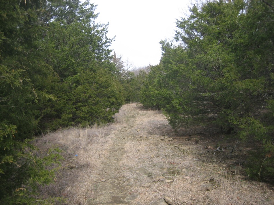 The Greenleaf Trail is a very pleasant surprise. Mostly traversing the hills rising out of the east side of Greenleaf Lake, this 17 mile loop trail provides a taste of the rugged terrain of the Ozark flank and some excursion into small patches of xeric sandstone prairie. It was also teaming with wildlife each time I was there in winter 2011. On my main hike I saw 12 armadillos and 4 wild turkeys. And those turkeys were big; chest high if they stood up straight! The Map: The map is true 1:24,000 scale based on the USGS 7.5 minute quadrangles. The free downloadable image is accessed by clicking the map on the right. Alternatively, it is available on 11x17 Rite in the Rain weatherproof paper for $5 by emailing cew5151@gmail.com ($5 per map plus S&H). The trail was tracked with a GPS in February 2011 and is shown in red. The named waypoints are shown with the larger maroon squares and the mile markers and other points of interest with small maroon squares. Some of the roads are based on aerial photos and Google Earth imagery. GPS File: Right click this link to download the track in a gpx format. Save it to you computer and use your GPS software to load it to your GPS. There are 933 track points so if it exceeds your saved track capacity, you will need to break up into more digestible bites. Google Earth Track: Right click this link to download the track in the Google Earth kml format and trace the route in interactive 3D. Save it to your computer and open it with Google Earth. The Hike: The official trailhead is located in the park, just off the road to the docks. Enter the park off Highway 10. At the top of the hill there is a guard station which is unmanned in the off season. To the right (north) is the park office where you can check in. Keep going straight at the guard station, wind down the hill and there is a big sign on the right announcing the trailhead (GL-01, mile 0.0). The trail is marked with a blue blaze and each miles is marked with a white sign that on close inspection also has the UTM coordinates etched on them. The mile markers are not always accurate. For example, mile zero is at the trailhead and mile 1 is 1.8 miles away. To avoid confusion, I differentiate between mile markers and GPS miles in the narrative. The trail leaves the trailhead and heads south through the hardwood forest. You are still in the main part of the park so you will see the park road to you left. In just a few hundred feet you will pass the back side of the 17 mile marker. At mile 0.3 you will pass under a little hut like structure and see a cabin on the lake at the end of the park road. In another few hundred feet you will be even with the earthen dam and the trail will start to follow a forest road. Not for long, however. Watch for the blue blazes leaving down hill to the left. After following the lake shore for 0.2 mile, the trail crosses the forest road and goes back into the wood. It will cross the road again in less than 0.1 miles. After crossing under a power line the trail will pass through the woods and come out on Highway 10. Turn left and walk across the Highway 10 bridge. On the other side the trail leaves the highway and heads east on a broad trail to the Alternate Trailhead. The Alternate Trailhead is accessed by a road off of Highway 10. Though most of it is tarmac, it is no longer maintained and is highly potholed. I have seen regular cars navigate it, but cars with very low clearance might not make it. There are some pull-outs at the bottom of the hill for parking. The trail from Highway 10 comes in just below (west) of the first and largest pull out. There is a low cable at the turnout that looks like the entrance to the trail. It is not the trail. The trail follows the road uphill for about 100 feet (above the pull out) and then turns left into the woods. There are blue blazes on the tarmac. This next section follows an arm of the lake heading for the swinging bridge. It passes mile marker 1 about 1.8 miles from the zero mile marker at the main trailhead and then a small bluff with an overhang the might be a good shelter for a surprise thunderstorm. You will pass a cedar groves and get some nice views of the lake. The swinging bridge (video) is at GPS mile 2.5 and mile 1.7 according to the mile markers (GL-03). It is a pedestrian cable suspension bridge that is safe and easy to cross. It is hard to tell from the map but the gray forest road shown on both sides of the bridge does not cross the lake. When you reach the other side, there is a forest road that leads straight ahead and then bends out of sight to the left. The dirt and gravel road, though well maintained is not open to the public. If you are following the clockwise loop and the sequence of the mile markers, turn left as soon as you get off the bridge and follow the blue blazes. If you are taking the counter-clockwise loop, turn right as soon as you get off the bridge and follow the blue blazes. Do not follow the road. Following the clockwise loop, the trail is relatively flat for the first mile or so. Just past mile marker 2 (GPS mile 2.8), the trail crosses the forest road, heads up a little hill, crosses an intermittent stream and cross the forest road again. Soon you will be contouring on a wooded hillside with occasional views of the lake. Just before going around a small inlet on the lake is mile marker 3 (GPS mile 3.7). Over the next mile, you will be crossing a micro xeric sandstone prairie ecosystem. The first thing to notice is are the abundant red cedars and then you will see the prairie grasses and yucca. Next you might observe outcrops of sandstone on the forest floor. You might also notice the gentle topographic slope towards the lake is controlled by the dip slope of the sandstone. What is happening is there is very competent bedding plane of the Bloyd-Hale Formation that is holding up the forest floor. It is resistant to erosion so the soil horizon is thin to non existent. The thin soil horizon means there 
