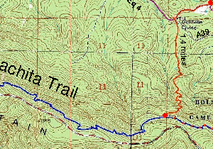 The Hike: Coming soon! Info: USGS 7.5 minute quadrangle topographic maps: LeFlore SE, Muse, Hodgen and Big Cedar (trails not shown). Contact Talimena State Park at (918) 567-2052. Contact the Ouachita National Forest, Choctaw Unit, Hodgen OK, at (918) 653-2991. Directions to Deadman Gap: Take Arkansas US Hwy. 271 to Talimena Drive (Highway 1) and go east 6 miles. Park at the Deadman Gap Vista on the north side of the highway. Trail crosses Talimena Drive a few hundred feet east of the vista. Directions to Horse Thief Springs: Take US 59 south of Heavener OK to the junction of Hwy 259 junction. Turn right and go 5 miles until the junction of Talimena Drive (Hwy 1). Take Talimena west for about 5 miles. Horse Thief Springs is well marked and on the right. To Buy Map: This map is available by emailing cew5151@gmail.com ($5 plus S&H). |