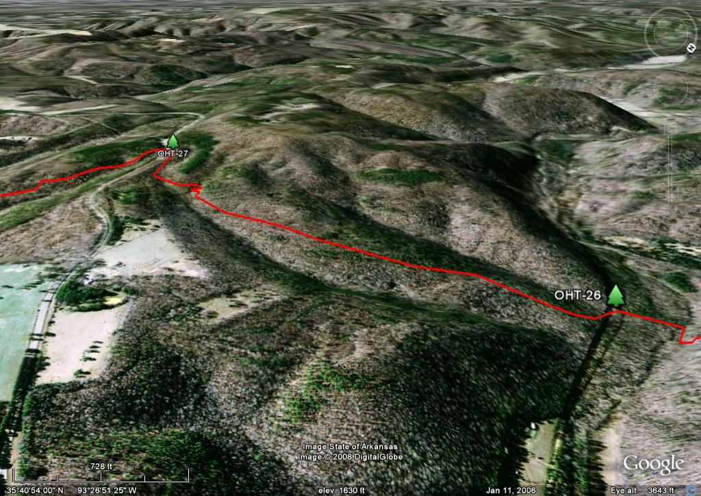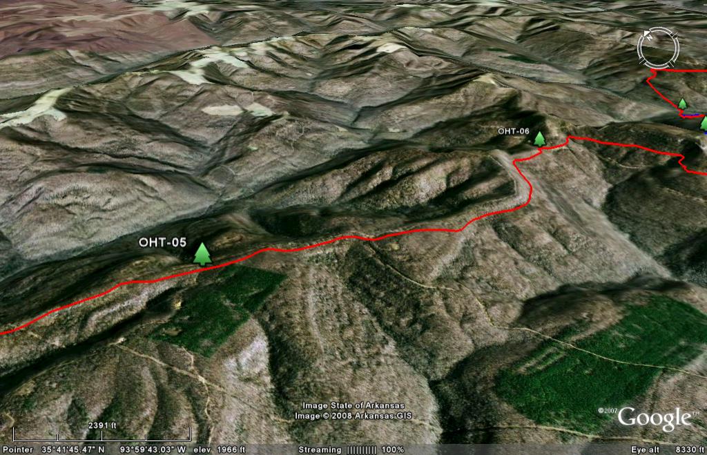 Skip the trail descriptions and jump to the topo maps NEW: The entire trail is now on Google Earth. See below. Background. It used to be said that the Ozark Highlands Trail (OHT) was 165 miles long, stretching from Lake Fort Smith State Park to Woolum Ford on the Buffalo River. Now it is a little more complicated. First, on the west end Lake Fort Smith and Shepherd Lake were combined into one, Lake Fort Smith State Park was moved 4 miles north and the old trail was flooded. A new trail section connects the new park with the existing trail in Jacks Creek. According to the GPS track we took April 17 2009, it is a mile shorter. Making it up at the other end is the east section of the Buffalo River Trail and the new Sylamore Section of the OHT. Though not actually part of the OHT, the east BRT is dozens of miles downstream from the west BRT terminous at Pruitt. The east BRT picks up where the OHT ends at Woolum and runs another 15 miles to the US Highway 65 bridge across the Buffalo River. Another 30 miles to the east as the crow flies is the Sylamore section of the OHT. Though far from being contiguous with the existing trail at Woolum, this 31.6 mile trail is officially part of the OHT. Both the east BRT and the Sylamore Section of the OHT will be part of the Trans-Ozarks Trail (TOT). When complete, the TOT will combine the Ozark Highlands Trail, the east BRT, the Ozark Trail of Missouri and many trails still to be built, to connect Fort Smith AR and St Louis MO. NEW! Trail Descriptions: The following links will give you descriptions and pictures of selected sections of the trail.
