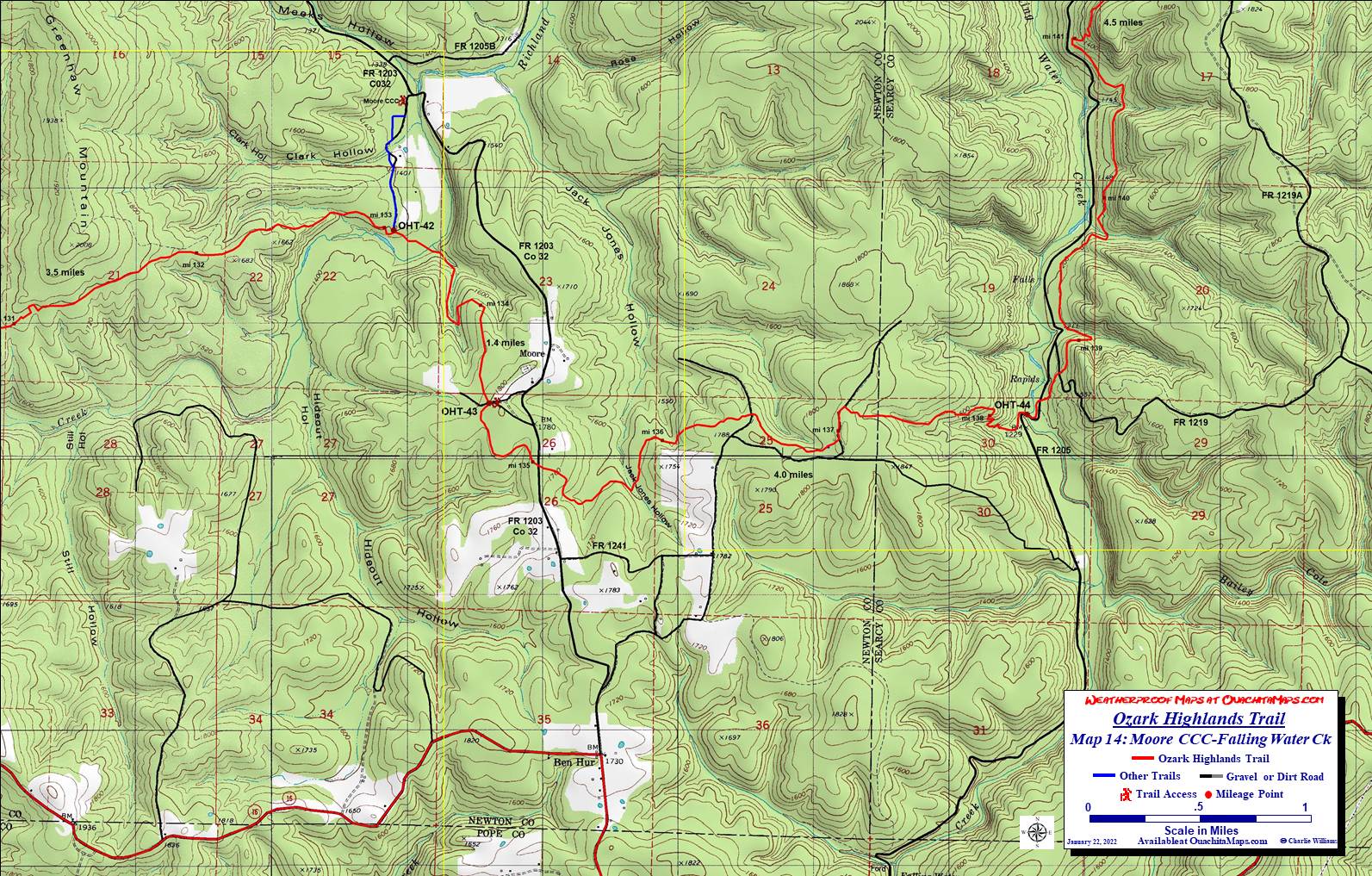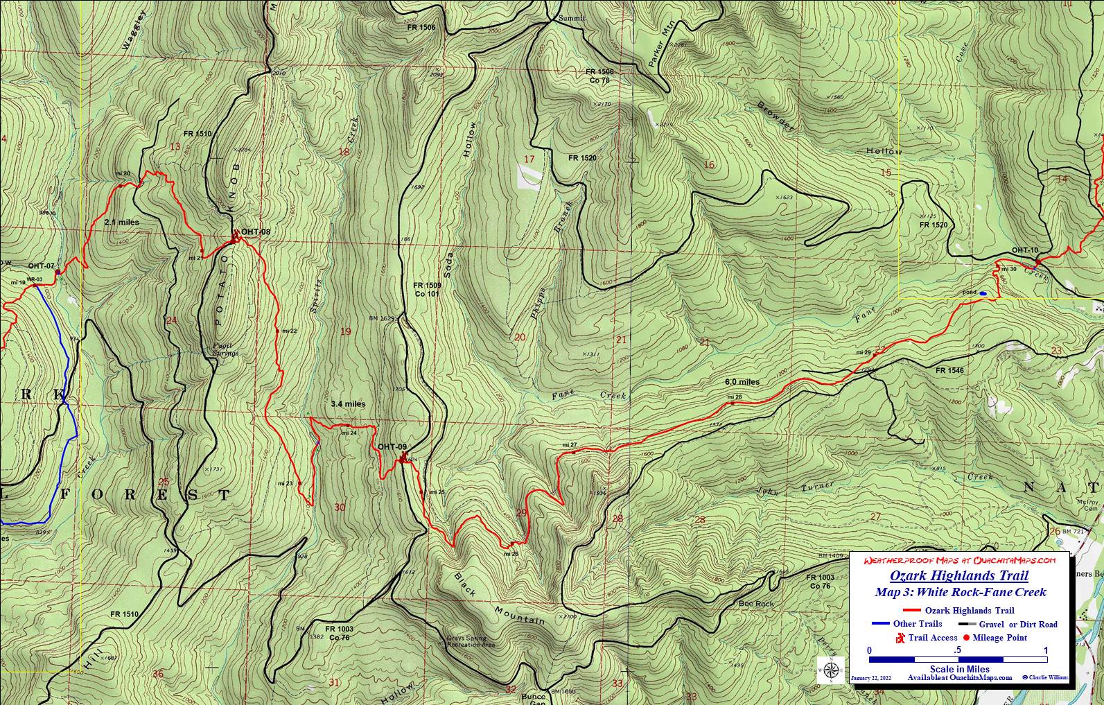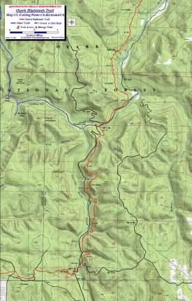 To Buy Map: If you don't want to take advantage of the FREE download, color weatherproof versions (11x17) of each map are available for $5 each plus S&H by emailing cew5151@gmail.com. A 20% discount is available if you want the entire set. That is $73 folded and delivered by mail in the US. Expensive, yes but cheaper than the $90+ for the full set of USGS topo, that don't have the trail. They are also available at Ozark Outdoor Supply in Little Rock and Pack Rat Outdoor Center in Fayetteville. |