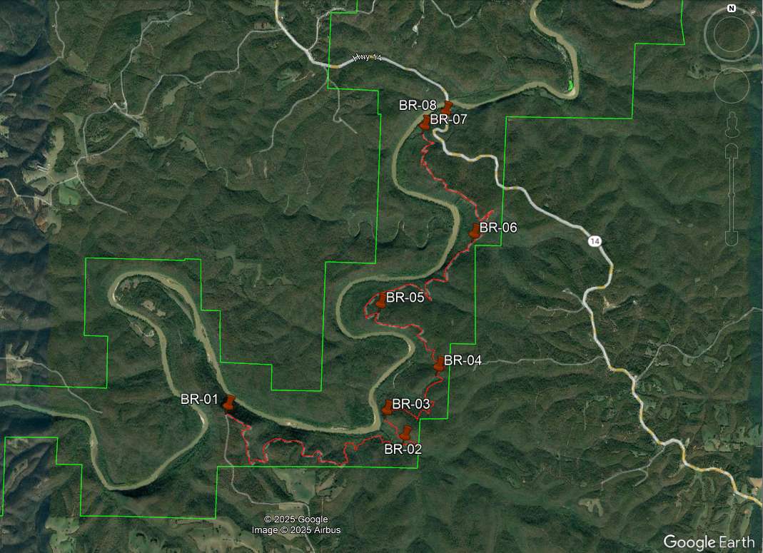 The tracks were taken in 2010 by a team consisting of Ken Smith, Bob Miller (Green Country Outdoor Club) and Rick Davis. The trail is in red and the Buffalo National River is outlined in green. Waypoints are designated with a maroon dot and labeled BR-xx. The mileages shown are between waypoints.