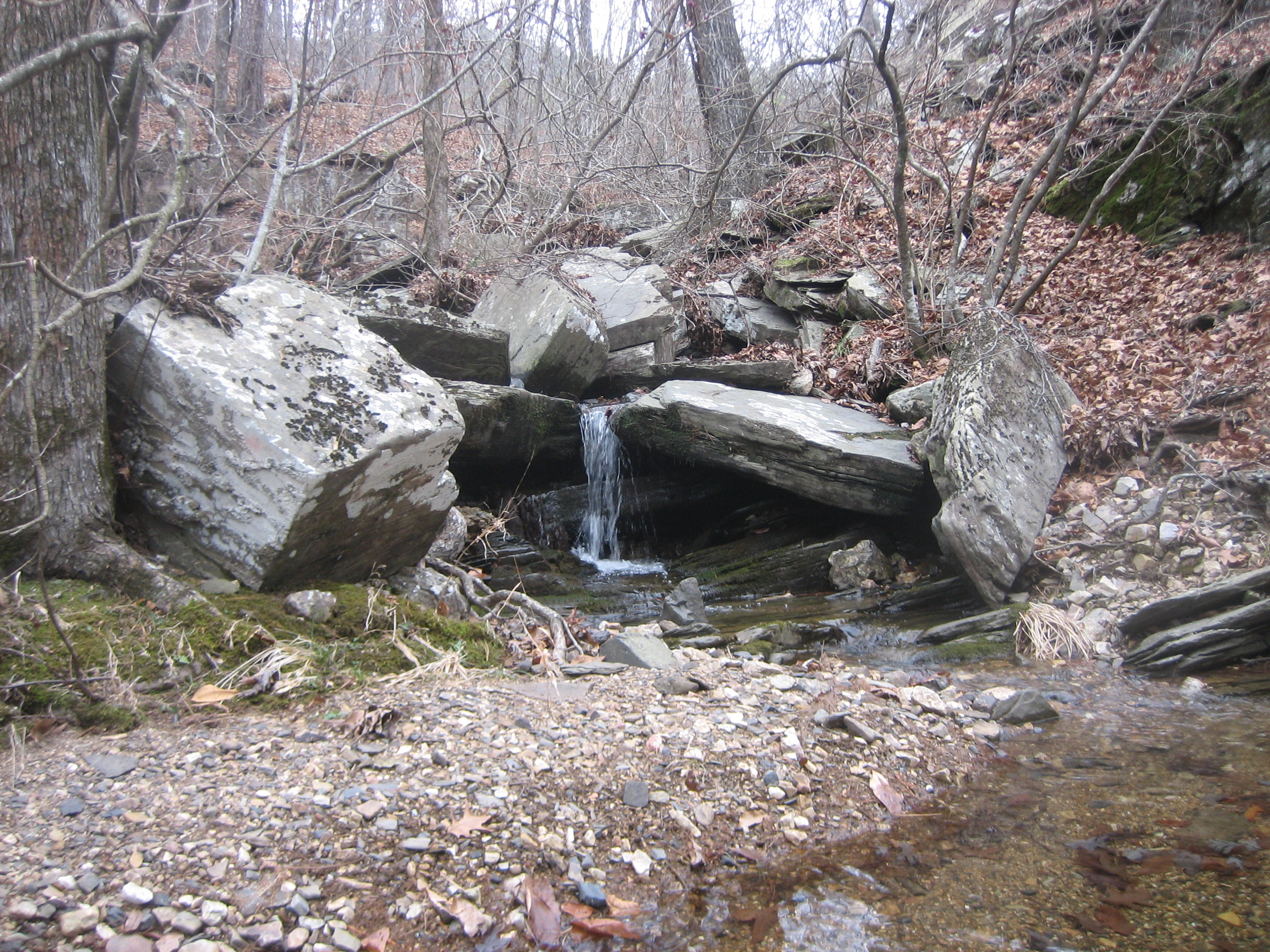 Coming out of the river you will head up a small flat valley, following and crossing a little creek. The valley narrows a little as it climbs about 100 feet to the divide that marks the edge of the Caney Creek watershed (1.5 miles). The trail drops into a shallow open hollow, crosses a picturesque rivulet and then climbs up a little hill. After another 0.2 miles, the trail drops off the hill bears left (east) and finally comes to the first Caney Creek crossing (2.2 miles). As with all the numerous crossings, this is a simple boulder hop under all but high water conditions.