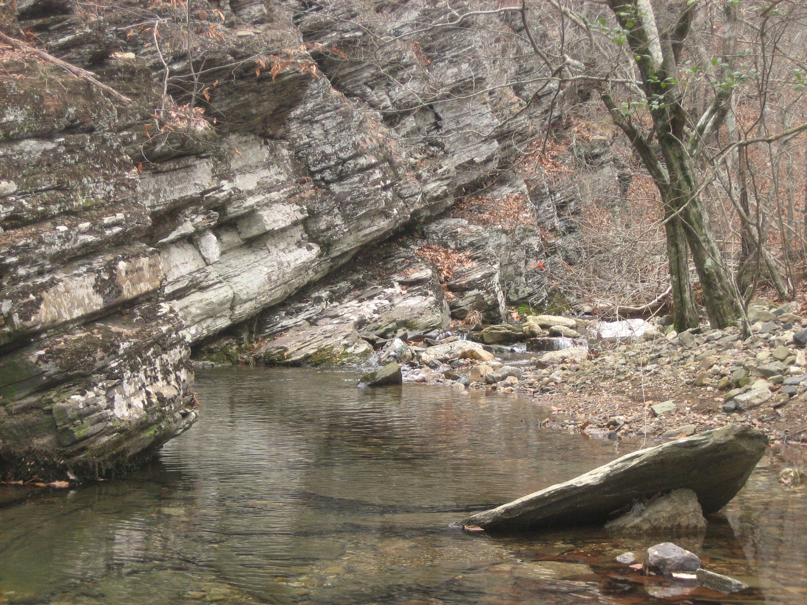 Caney creek has very clear water, much clear than lots of the other parts of the Ouachita. Much of this is due the underlying rock, the Arkansas Novaculite. The Arkansas Novaculite is a white to grayish-black sedimentary rock made of microcrystalline silicon dioxide, i.e. it is a massive layer of chert. Deposited in Devonian to Mississippian times, it was formed in a sediment starved ocean basin that existed south of the then North American continent. The term novaculite comes from the Latin for "razor stone" and is used because the rock can be chipped to shape points and edges for arrowheads and the like. It is also a commercial source of whetstones.