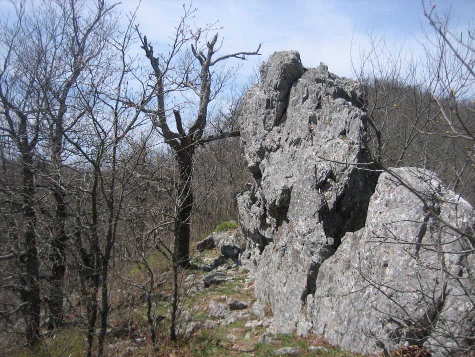 The next 2.4 miles is on top of the ridge, with a few brief excursions down the slopes to either side. At 2.8 miles there is a campsite that can hold several tents, but there is no water. In fact, there is no water until you get down into Caney valley, so plan accordingly. At 4.2 miles the trail comes up to a big outcrop on your left and veers off to the right. There is a tempting path the takes you along the outcrop and then begins to head downhill. It is not the trail.