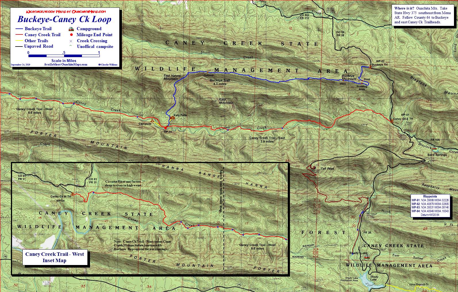 The Map: A free full size version of the map is available on this page as a downloadable jpg. It is also available printed in color on 11x17, "Rite in the Rain” all weather writing paper for $5 plus S&H by emailing Charlie at cew5151@gmail.com. The map is nominal 1:24,000 based on USGS 7.5 minute quadrangle topographic maps. The Caney Creek Trail is red, the Buckeye is blue and the spur trails are yellow. All were mapped with a WAAS enabled GPS. Other features include forest roads, trailheads, creek crossings, segment mileage, general directions, waypoints and waypoint coordinates. An inset map of the same scale is used to fit the entire Caney Creek Trail on one map. Lines show where the two maps overlap.