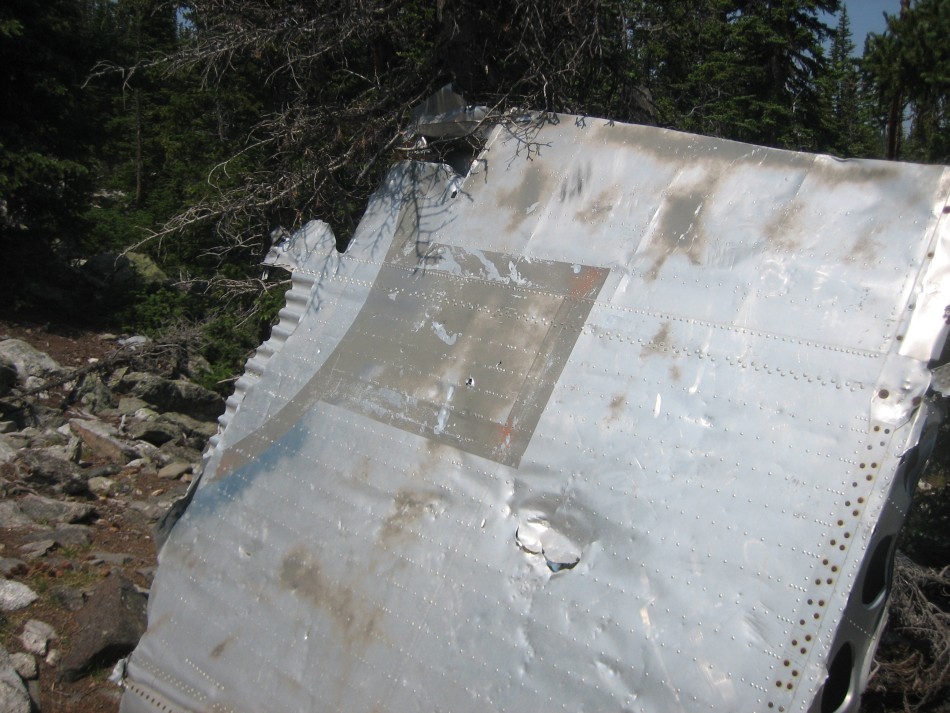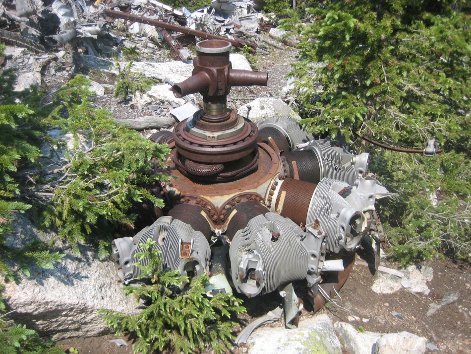A B-17 was carrying 10 people when it crashed on the north side of east ridge of Crown Point at about 10,750 feet on June 13, 1944. Four service men died on this training flight due to a navigational error and 6 survived. About 6 weeks later the army (this predates the formation of the US Air Force), dynamited the wreck (video) destroying the main fuselage and scattering parts down the side of the hill (video). Though the form of the plane is unrecognizable, there are many identifiable engine parts, wing sections with the flying star faintly visible and a gun turret cage.