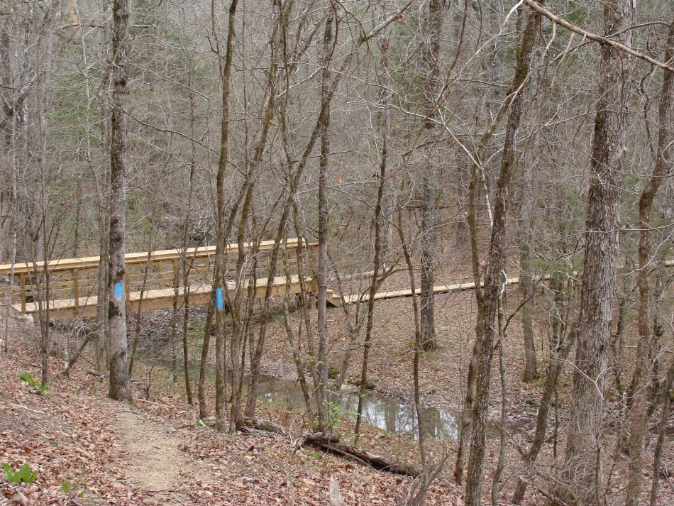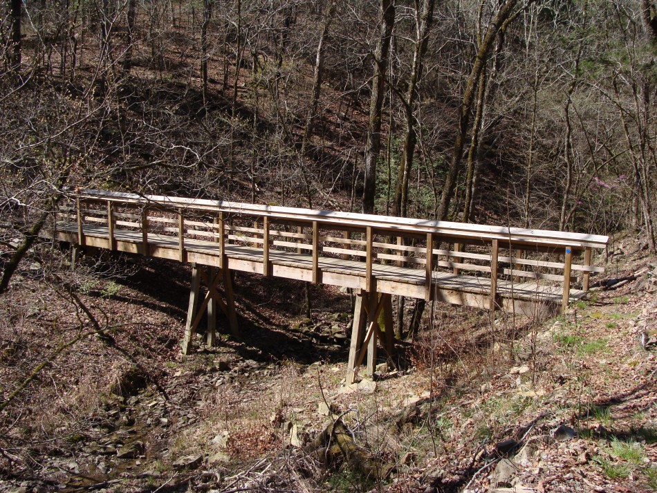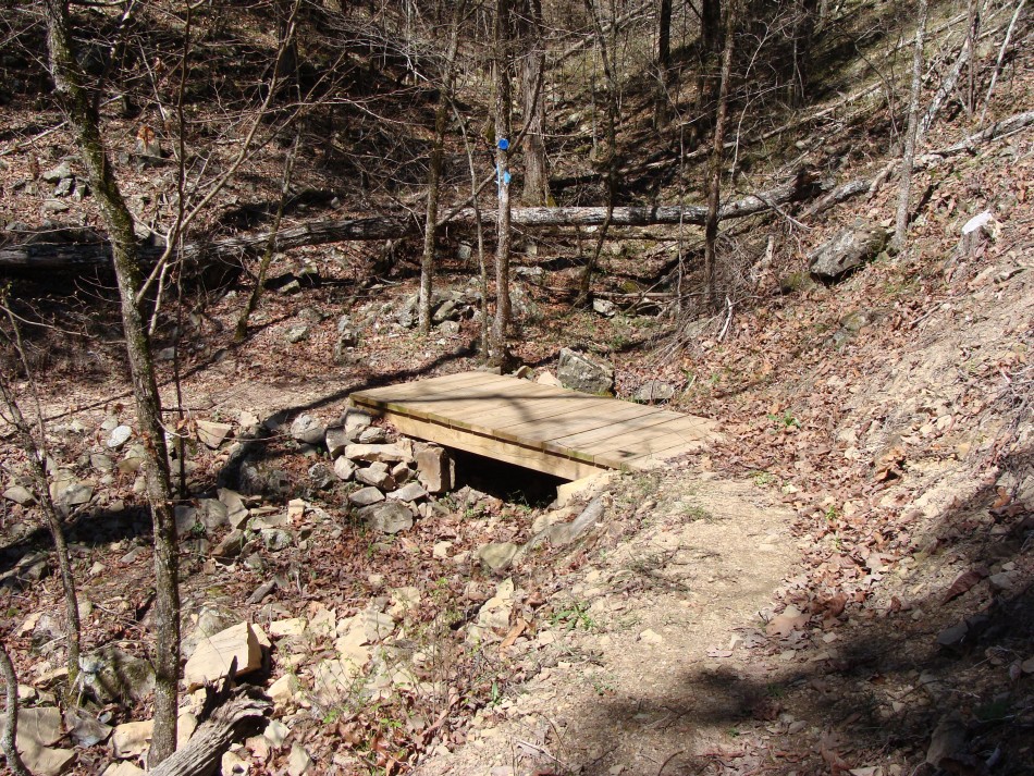 At about mile 9.2 the trail crosses Rd 52212, a well used gravel road that goes to the Deer Camp area. The road is gated at Rd 52200. After crossing the road the trail goes through some bottom land. Here you will find a the bridge #33 and #34 complex. It begins with bridge #33 crossing the main creek. Then there is a long walk way to limit erosion in a low, potentially boggy area, followed by bridge #34.