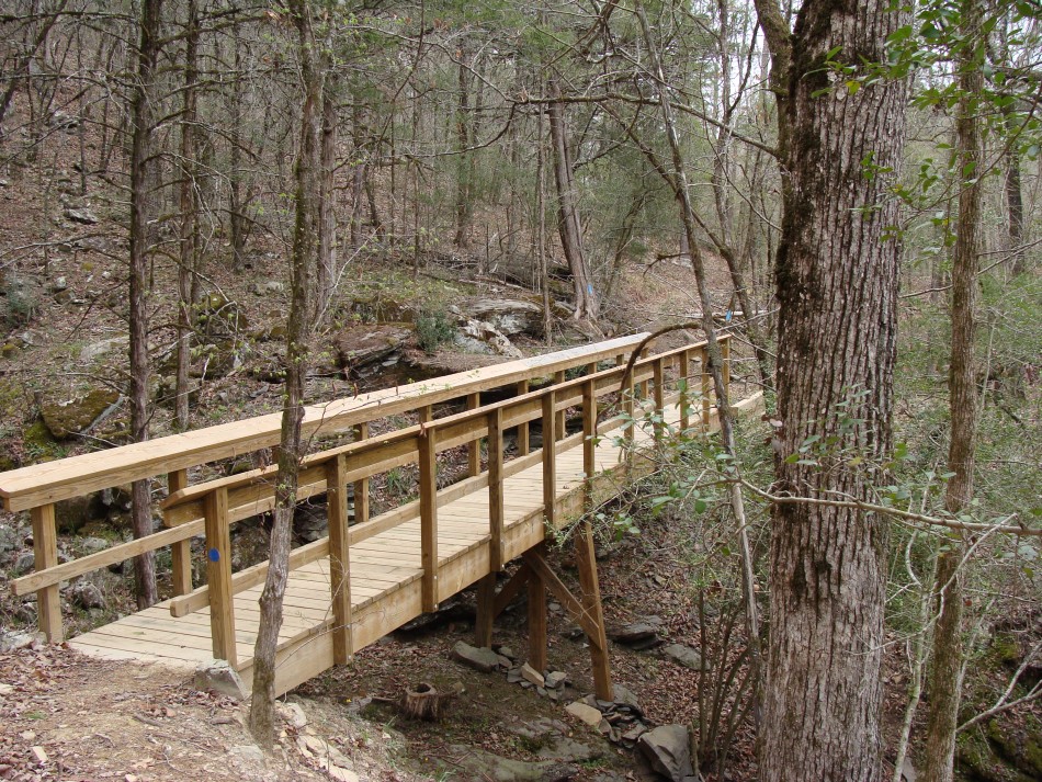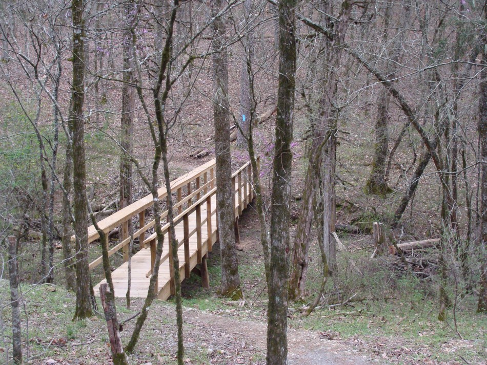 There are thirteen foot bridges between Brushy and Ed Banks, some of which are very elaborate. Others, though minor in stature, speak to the attempt to minimize erosion and the detrimental effect it would have on the water quality of the Cossatot. For the hiker it means little chance of getting your feet wet!