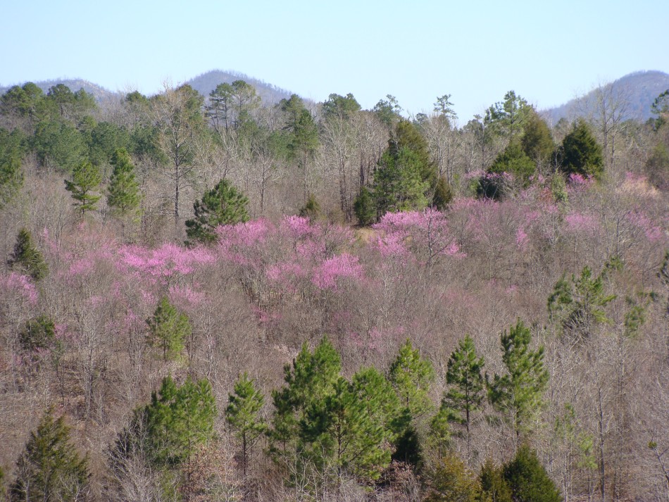 Although the trail stays high above the Cossatot over this next section, the river can be seen below through the trees. The redbuds were prolific all along this first section of the trail from Brushy Creek to Ed Banks bridge. In fact, one area held the largest stand of redbuds that I have ever seen. This stand was on the east side of the river. In addition, wild plum was everywhere and the odor was nothing short of fantastic! There were also many large rocks where thrust faulted blocks of Mississippian sediments of the Stanley Formation are exposed in the forest. One large rock outcrop had a large cedar growing beside it.
