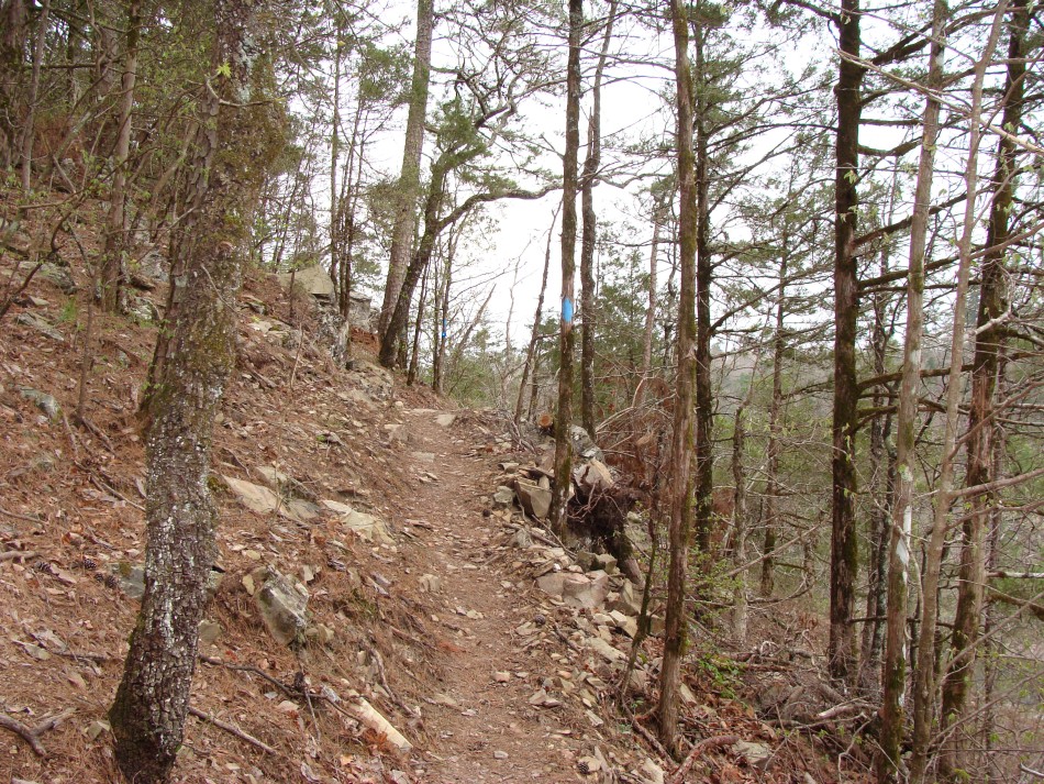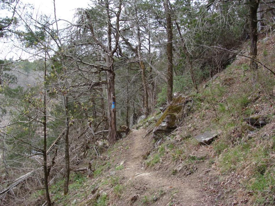 Leaving the Ed Banks area the trail starts to climb and you go thru lots of cedar. Below are lots of good of views of the Cossatot River. The trail continues high above the stream through lots of rock and plenty of redbuds. The river, even when low, has lots of interesting features that provide a hint of what attracts the whitewater enthusiasts.
