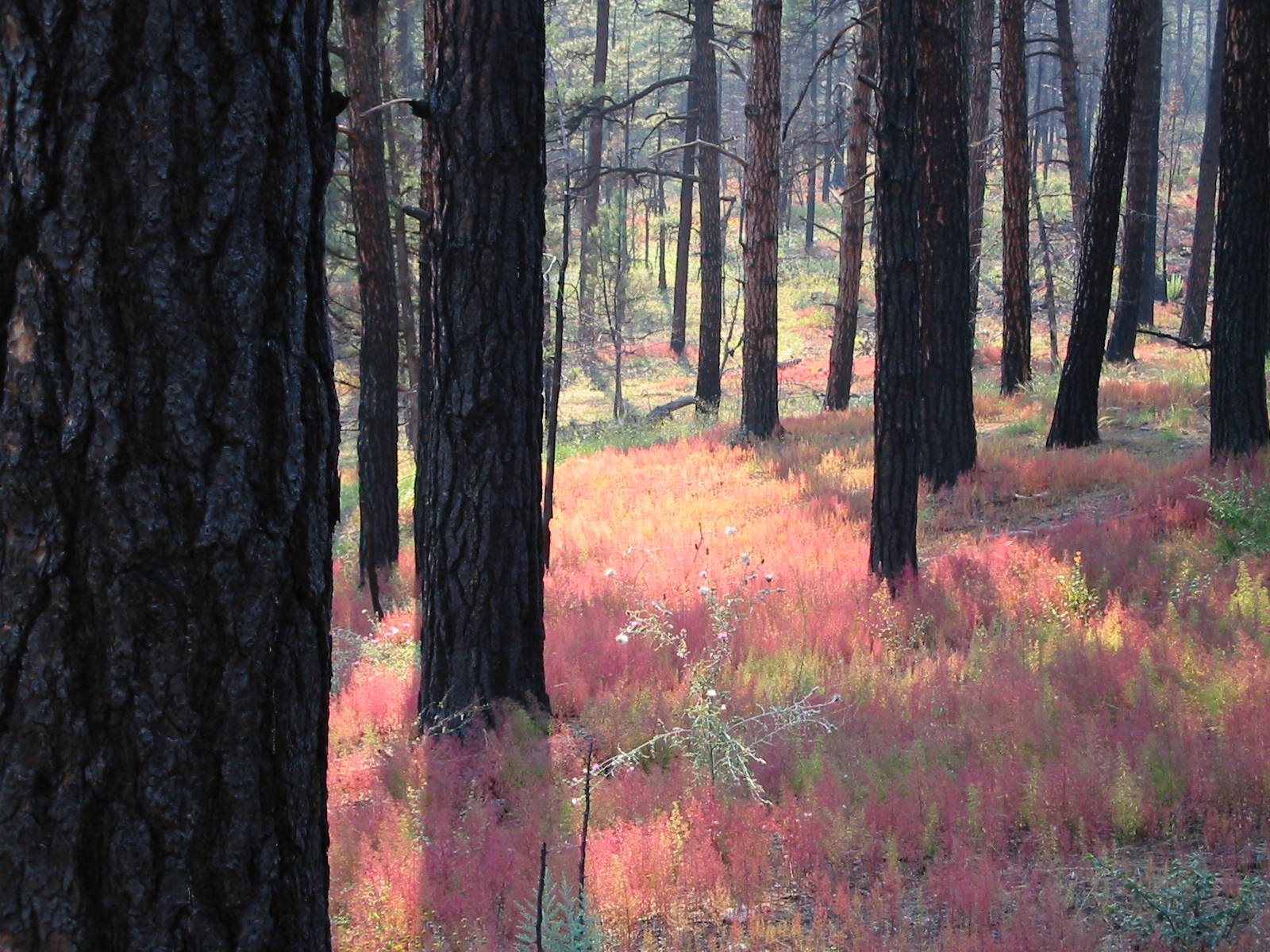 The West Fork Trail continues west but we took the Big Bear Trail #28 to the north. It was a gradual 600 feet over several miles to the top of the mesa Higher on the mesa, the forest is dominiated by ponerosa pines. These statley trees define the 6,000 to 9,000 foot elevation with their platey bark and 4 to 7 inch needles in a fascicle of three.
