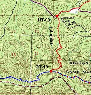 The Map: A free full size version of the map is available on this page as a downloadable jpg. It is also available printed in color on 11x17, "Rite in the Rain” all weather writing paper for $5 plus S&H by emailing Charlie at cew5151@gmail.com. The map is nominal 1:24,000 based on USGS 7.5 minute quadrangle topographic maps.The Loop was mapped with a WAAS enabled GPS and is drawn in different colors to designate each trail. The map shows the OT (blue), Boardstand (green), INT (yellow), other trails (purple) and forest roads not shown on the standard quads (gray). Other features include trailheads, segment mileage, general directions to park, waypoints and waypoint coordinates.