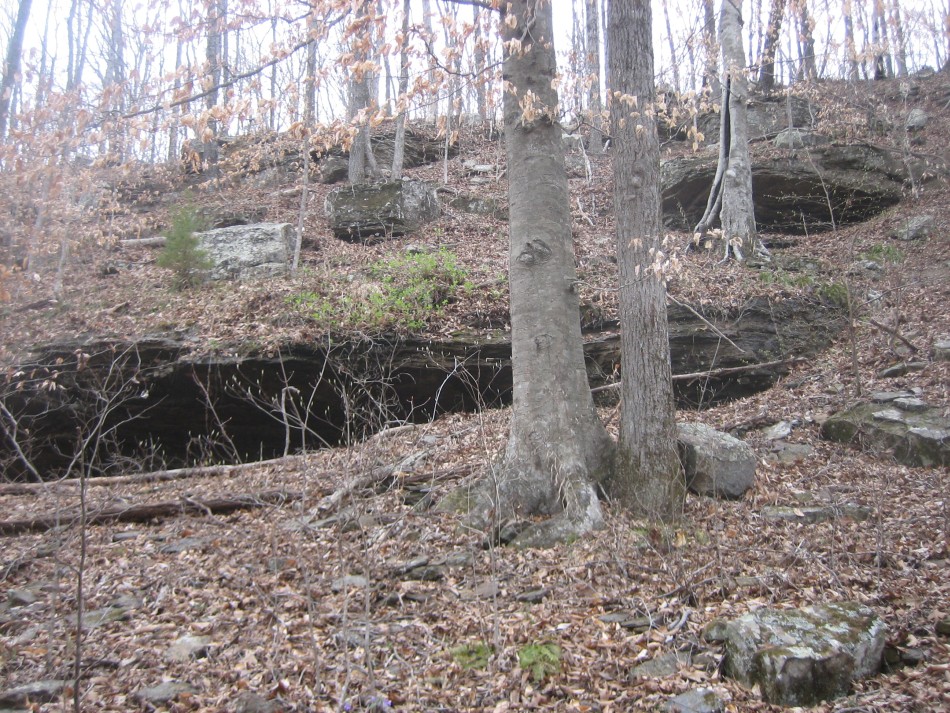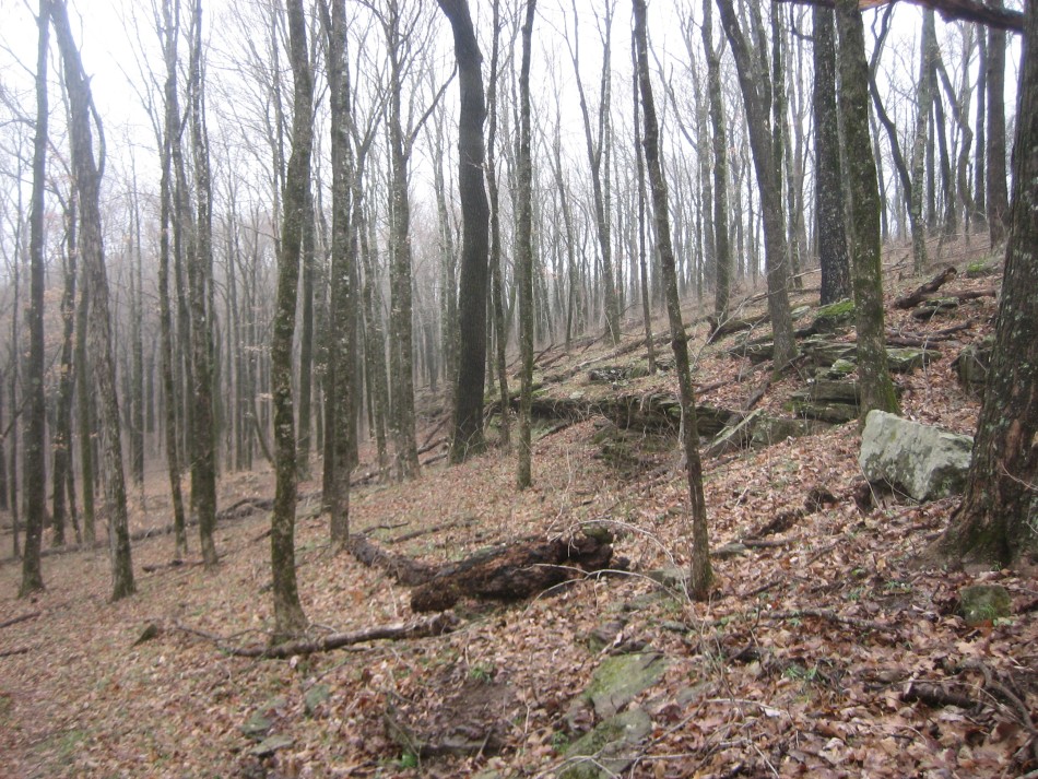 At OHT-18 turn left and cross the Little Mulberry River (video) on a concrete road bridge. No wet feet here no matter how much rain (unless that Noah guy shows up). Stay on the road for 0.3 miles and just past the pasture on the right, turn right and follow the easement. Climbing out of the bar ditch you will see a stand of river cane. Follow the narrow easement for a little over 0.1 miles until the trail enters open forest. The forest up to mile marker 57 is hardwood on a fairly gentle but rocky hillside. Past mile 57, it becomes very rocky with bluffs to your right and boulders the size of a truck. I found this area very scenic. The last part of this section is a boulder hop across Lick Branch. Cross county road 5051 (OHT-17, OHT mile 56.3, trip mile 29.3) and the Lick Branch trailhead is on the right.