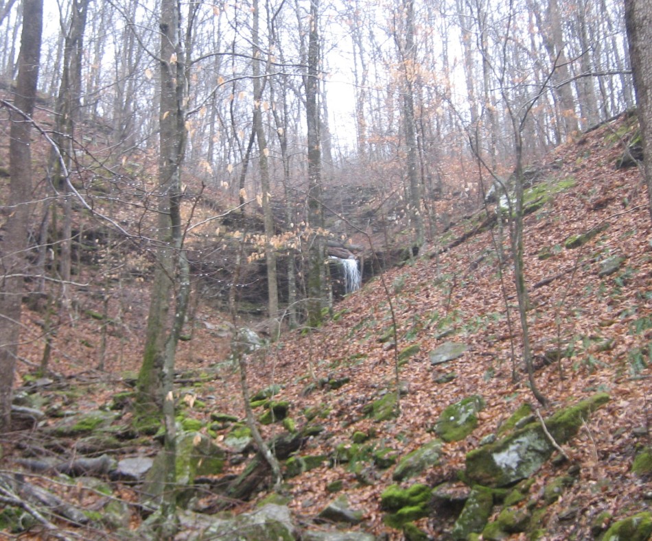 Moonhull Mt to Hignite Gap (OHT Map 7):From FR 1418, the trail leads down to Waterfall Hollow (video), aptly named because of the three pour-offs that rim the east end of the valley. The trail down to mile marker 78 is good but soon after that is get sketchy. There is a lot of blow-down, or maybe it was damage from the ice storm of 2009. Whatever caused it, many of the trees that lined the trail are lying on their side with the rootstock forming minor obstacles. Also, the waterfalls have quite a bit of downed timber blocking their view.