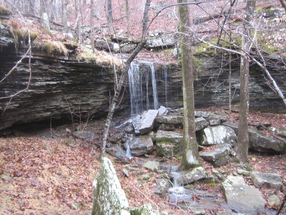 In 0.6 miles there is a campsite on the right. It is worth stopping and checking out the bluff (video). The Atoka sandstone is fairly massive here and forms some 30 foot cliffs around a small drainage. The top is mossy and there is a small chasm where a huge section has broken away from the bedrock. There is a stream about 400 feet further down the trail that should be reliable most of the year. Across the creek, the OHT heads west along the top of a ravine and passes mile marker 60. The next 2 miles is a 600 foot descent on switch backs. My favorite part was the massive moss covered outcrop at the bottom of the mountain.