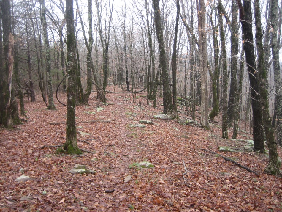 The OHT stays on a level bench in the vicinity of mile marker 67, works its way around another pour-off just below Hignite Gap and begins a 350 foot climb. After passing mile marker 66, there is a switch back and finally Forest Road 1474/1453 (OHT-20, OHT mile 65.7, trip mile 19.9).