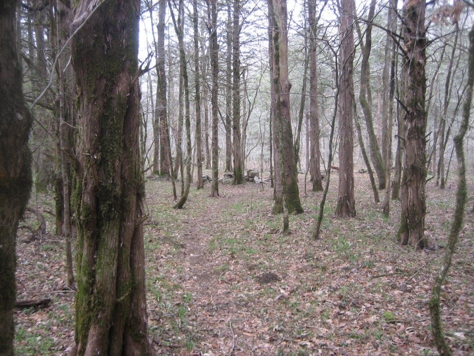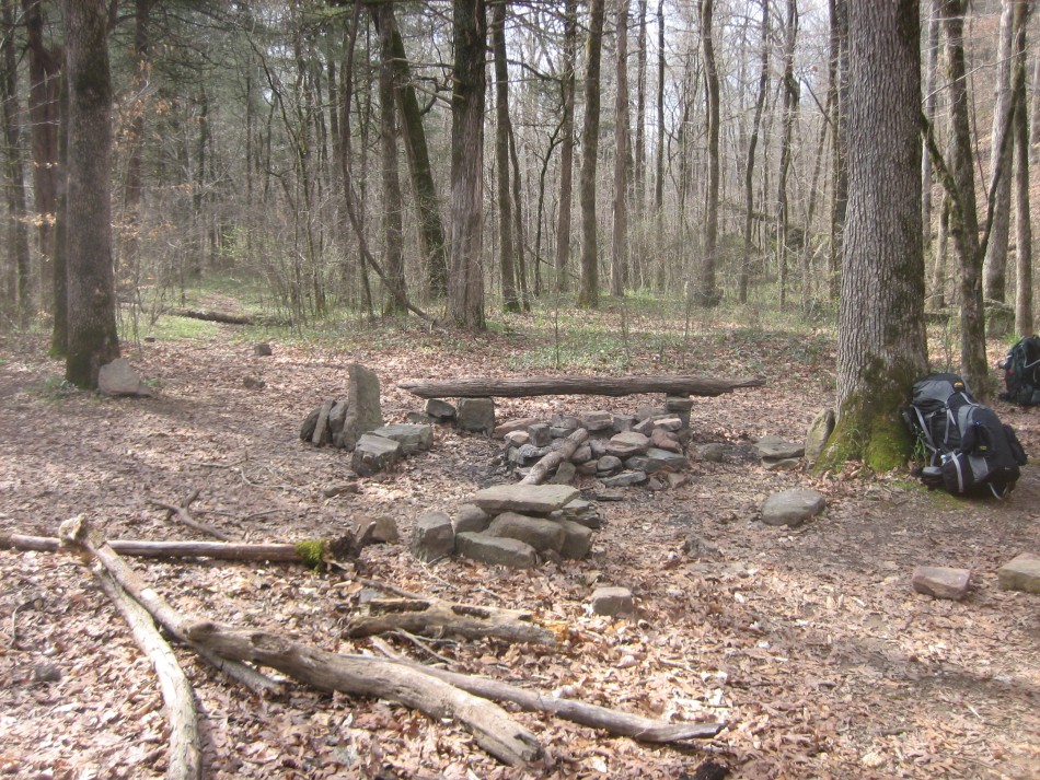 It is just shy of a mile to Indian Creek on the OHT, all down hill. When the trail reaches the valley floor you will see a large flat expanse of fairly open forest with lots of cedar and one really tall sweetgum. The main campsite is a little further down the trail near the creek and has an Arkansas fire pit and stone furniture. We opted for an LNT camp in a large open area next to a stand of river cane south of the trail on the east edge of the valley floor. However, with such a large flat area, you can find many other places to set up camp if need be.