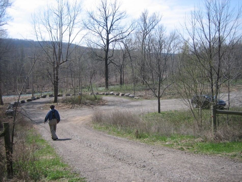 Lick Branch to Morgan Mountain (OHT Map 5): The Lick Branch trailhead is accessed by going north from Highway 215 on Co 5099 for about 2 miles and then left on 5051. The parking lot has room for half a dozen cars. There is a big fire ring at the west end of the parking lot and a smaller campsite between the parking lot and the creek to the south. There are some social trails around the parking lot so follow the white blazes to get to the other side of the small creek.