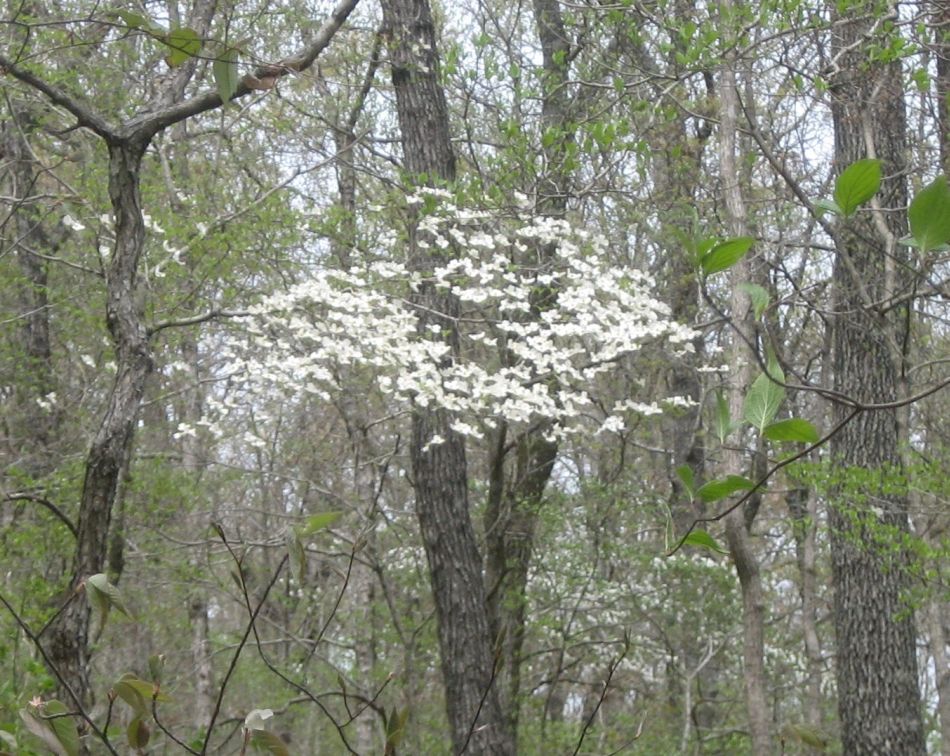 The ground cover was still the winter carpet of dead leave but even during the four days on the trail the new spring foliage was emerging. The earliest out were the phlox with their blue blossoms. We also saw pussy toes, spring beauty and bloodroot. Popping out of the forest litter like a tiny green bumbershoot with a yellow bell cap were the may apples. Though some were already open, their number had noticeably increased by our last day. By the time April comes, they can cover large swaths of forest floor.