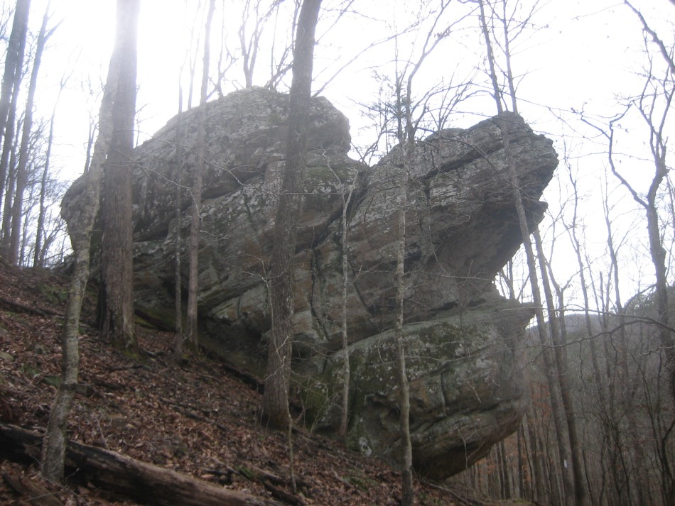 The trip from Big Piney to Ozone ia 19.9 miles. The OHT back that direction is at the back of the parking lot. There are some social trails there too, so watch for the white blazes as the trail heads due west. Head up hill crossing FR 1002 and into the woods. This is 1.2 miles to Haw Creek Falls Recreation Area. The short section is pretty, dominated by a huge rock next to the trail.