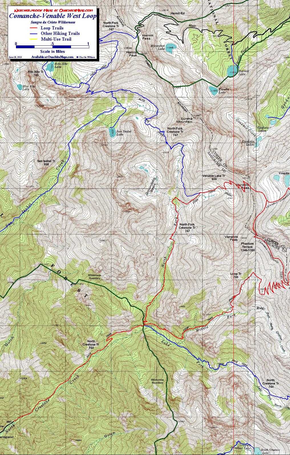 The Sangre De Cristo Mountains are a northwest-southeast trending spine in south central Colorado that features a series of northeast-southwest trending glacially carved valleys. While there are trails going up many of the valleys, these maps focus on one of the few "official" loops. There are two versions of the loop. The more popular east loop starts on the east side of the range at Alvarado Recreation Area near Westcliffe and uses the Comanche and Venable valleys to enter and exit the high country. Connecting the two, traversing the connecting ridge, is Phantom Terrace. Phantom Terrace is also the connector for the west version of the loop. It begins at Crestone Campground and uses the Middle and North Forks of Crestone Creek.