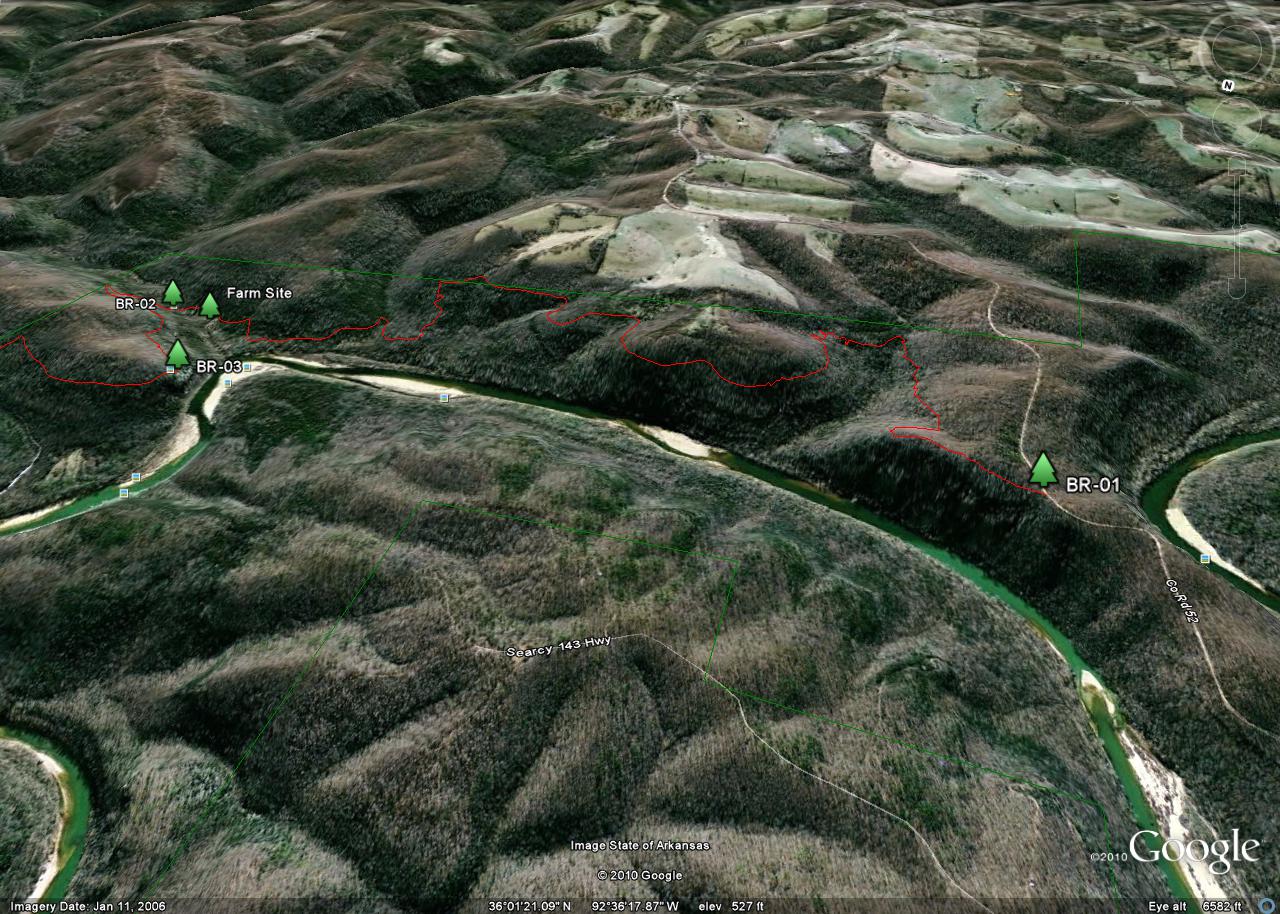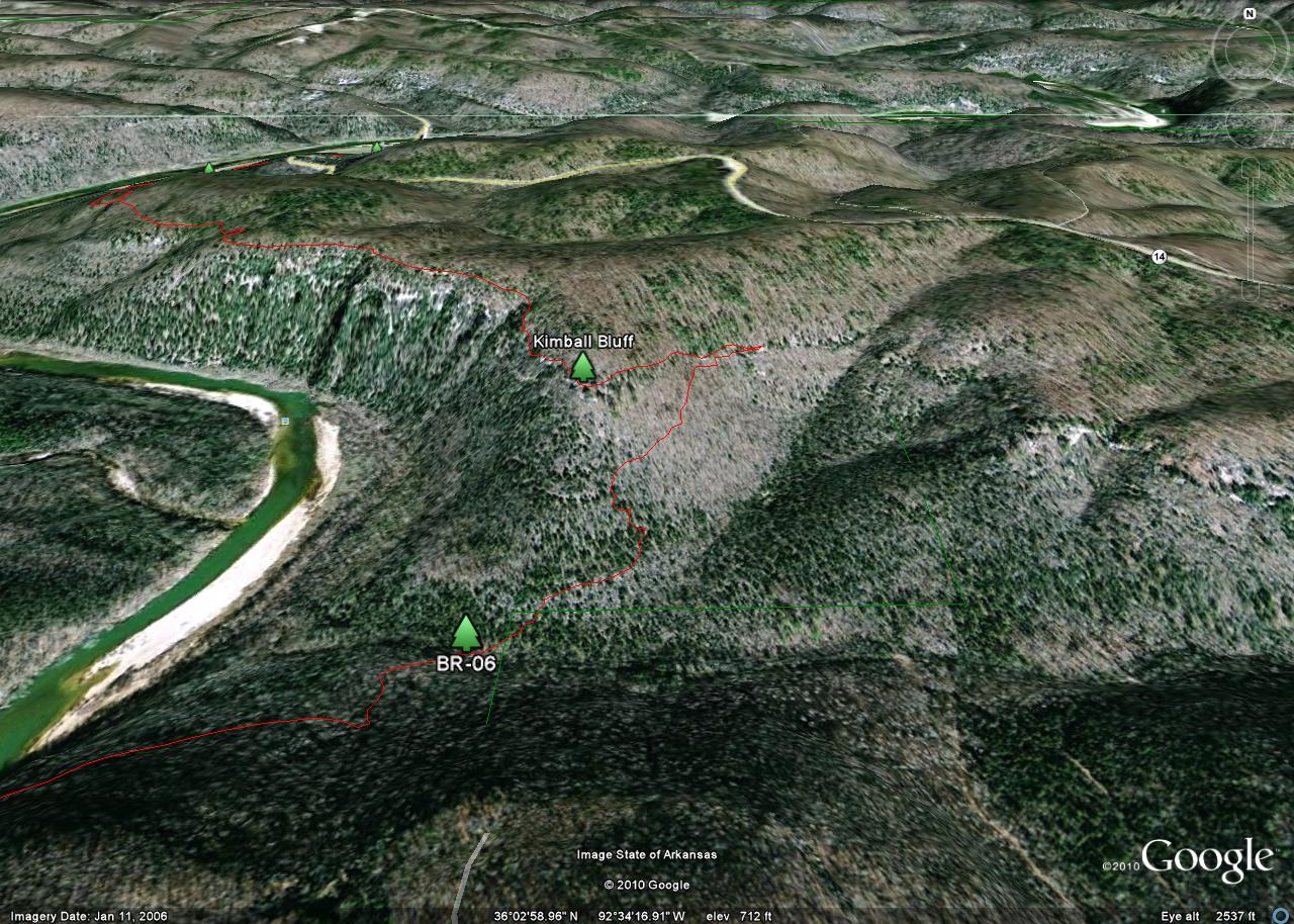 The tracks were taken in 2010 by a team consisting of Ken Smith, Bob Miller (Green Country Outdoor Club) and Rick Davis. The trail is in red and the Buffalo National River is outlined in green. Waypoints are designated with a maroon dot and labeled BR-xx. The mileages shown are between waypoints.