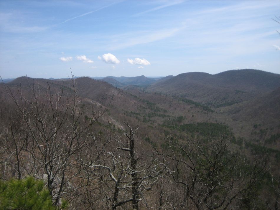 The next 2.4 miles is on top of the ridge, with a few brief excursions down the slopes to either side. At 2.8 miles there is a campsite that can hold several tents, but there is no water. In fact, there is no water until you get down into Caney valley, so plan accordingly. At 4.2 miles the trail comes up to a big outcrop on your left and veers off to the right. There is a tempting path the takes you along the outcrop and then begins to head downhill. It is not the trail.