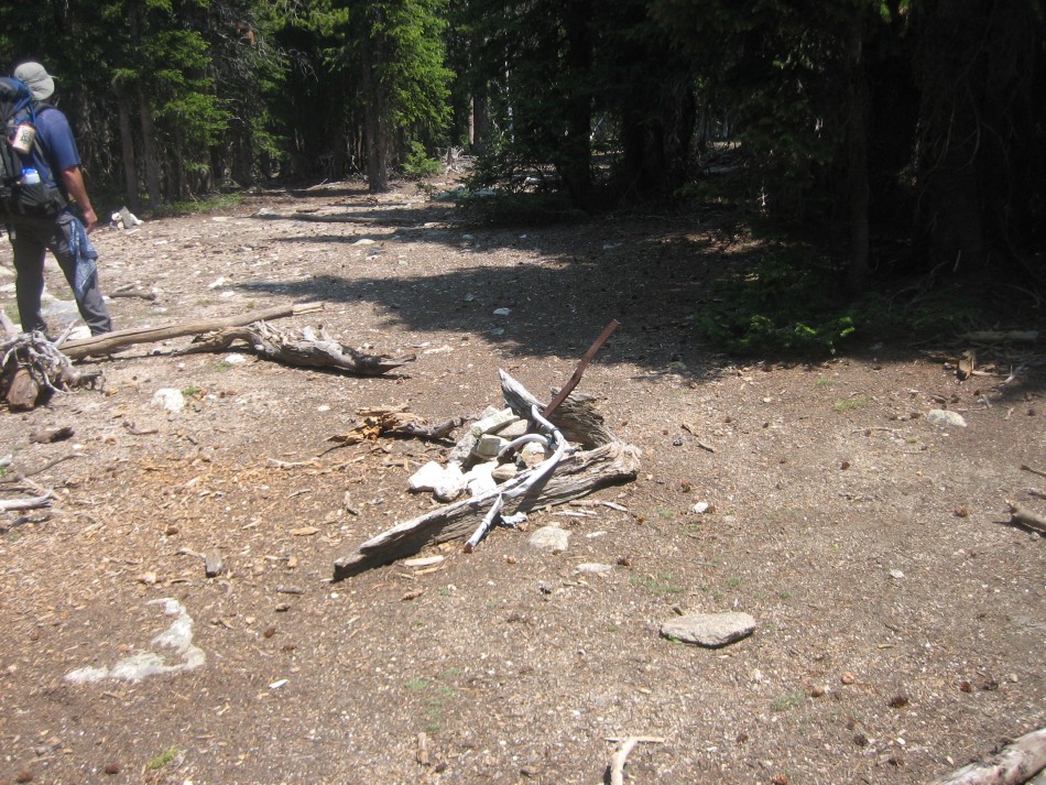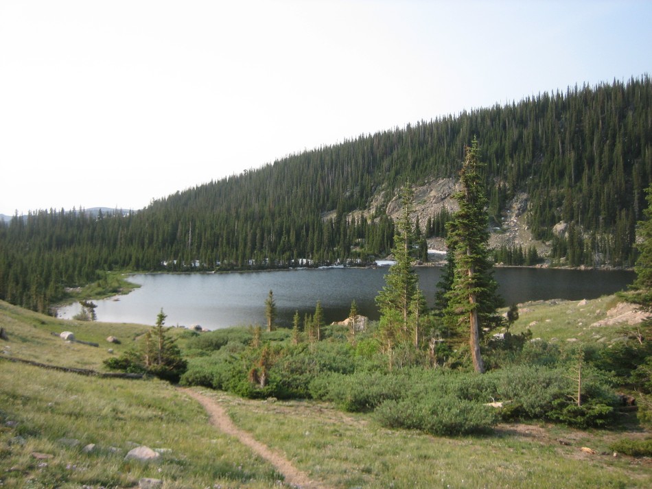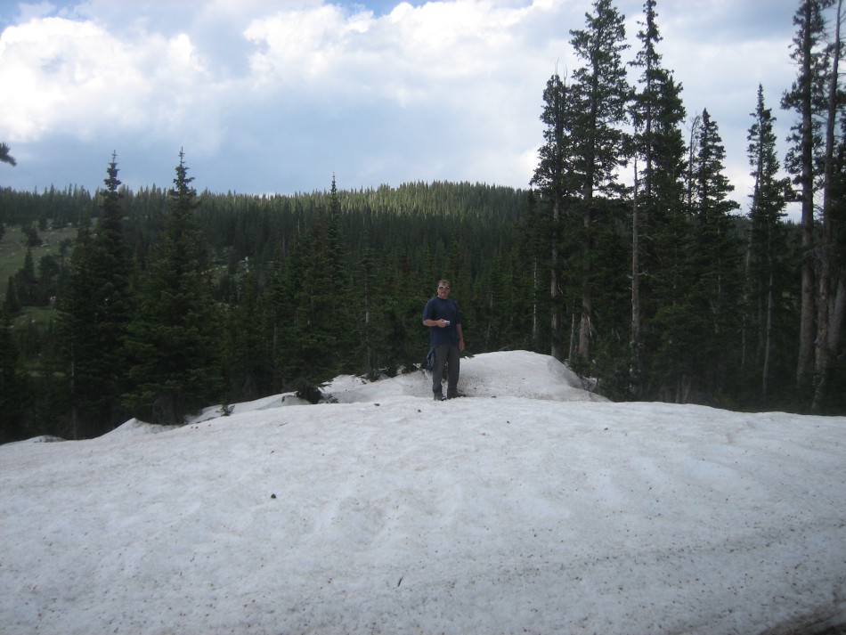 At the head of the lake (video) is the wilderness boundary and the entrance to the Travel Zone (4.0 miles). Camping in the Travel Zone is restricted: designated campsites (no reservations, first come basis), campfires are not permitted, parties limited to 12 beating hearts (meaning dogs etc. included in the count) and dogs on a leash. After a trek through an open meadow with bluebells and buttercups, the trail passes the Comanche Lake Trail junction (990), crosses a small creek and reaches the junction of the Brown Lake Trail (941). Follow the Brown Lake Trail up 800 feet (video) through an open forest and then into the thick woods above Brown Creek. (Note: Brown Creek Trail in this is section is west of the trail depicted on the USGS 7.5 minute quadrangle but corrected here.) The designated campsites begin just before Timberline Lake. Also in the woods on this side of the lake were some monster July snow banks, a testament to the heavy snow pack and deep shade on the north slope of the Brown Lake basin.