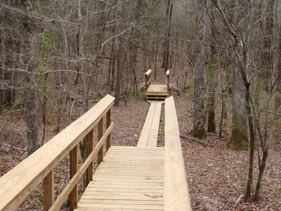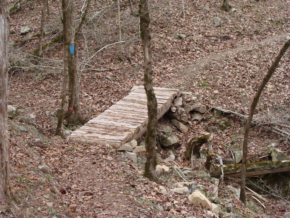 At about mile 9.2 the trail crosses Rd 52212, a well used gravel road that goes to the Deer Camp area. The road is gated at Rd 52200. After crossing the road the trail goes through some bottom land. Here you will find a the bridge #33 and #34 complex. It begins with bridge #33 crossing the main creek. Then there is a long walk way to limit erosion in a low, potentially boggy area, followed by bridge #34.