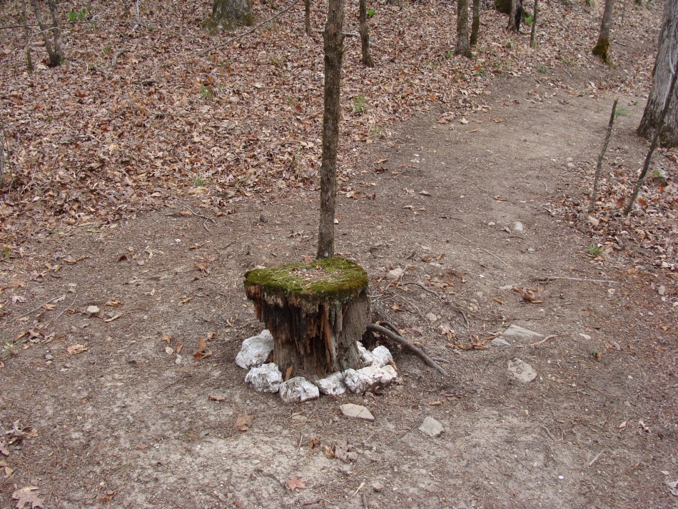 The trail leaves the Cossatot Falls area by crossing two long bridges. After the second bridge the trail leaves the path to the falls and takes a left up the side of the hill. The trail is more challenging through here. Soon bridge #24 spans a v shaped creek bed that flows on the bedding plane of what appears to be a medium bedded quartz sandstone. As with many parts of the trails there are plenty of good views of the river below. The next bridge, #25, was made out of split cedar, the only one made of that material. After some uphill on a single track trail, the trail tops out on top of a wide ridge. The trail follows a double track logging road for a while and then reverts to single track, again. The most rugged part of the trail is after the trail leaves the ridge and follows the steep hill sides in and out of five hollows on the way to bridge #32. Again, more scenic views of the river, below. Just before bridge #29 is a unique stopping place where there is an old tree stump that the construction crew saw fit to leave in the middle of the trail. The trail splits around the moss padded stump and it can be a very nice place to stop and take a load off.