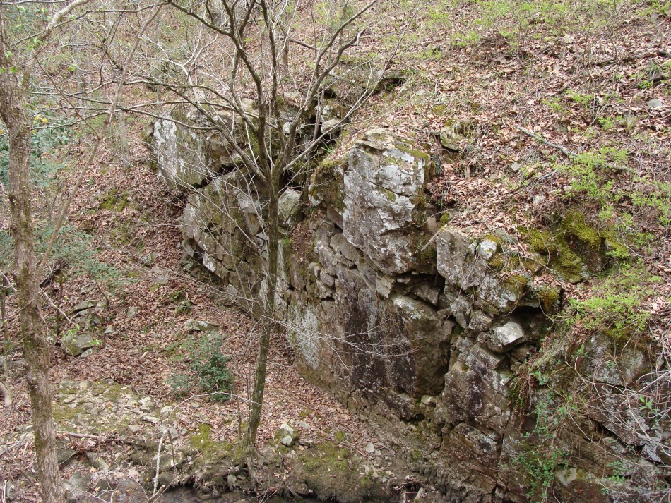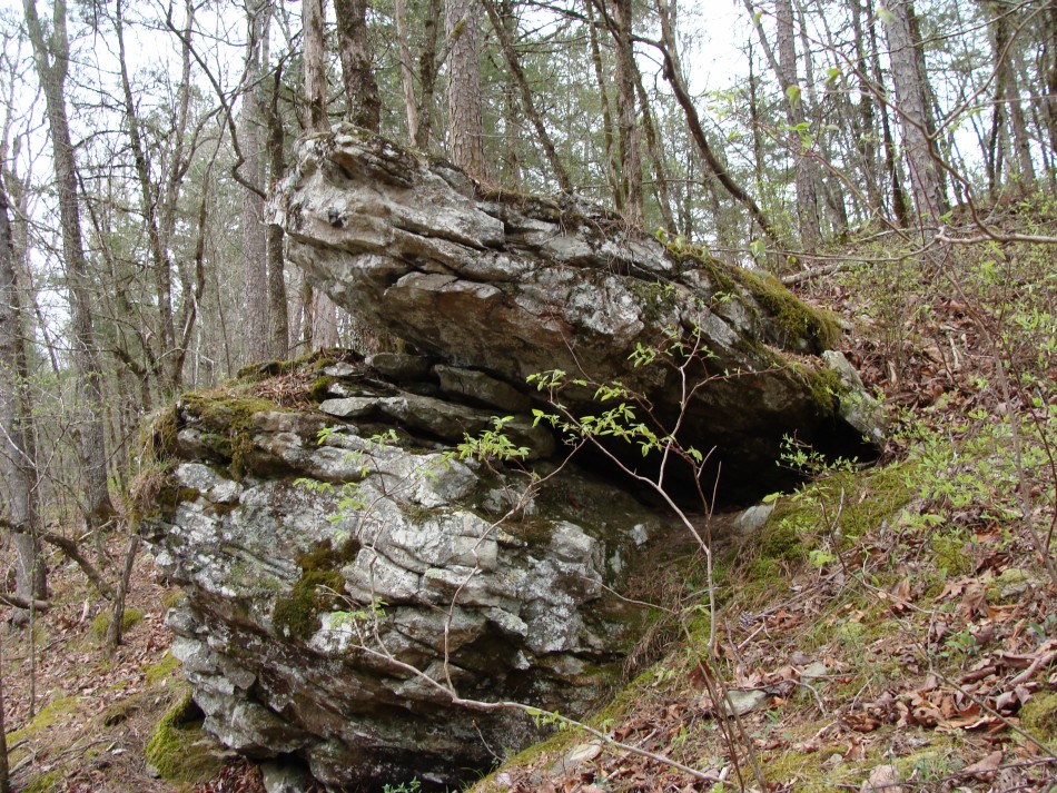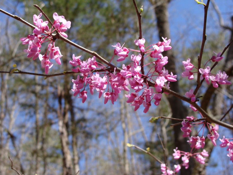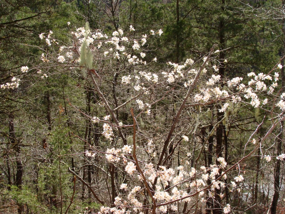 Although the trail stays high above the Cossatot over this next section, the river can be seen below through the trees. The redbuds were prolific all along this first section of the trail from Brushy Creek to Ed Banks bridge. In fact, one area held the largest stand of redbuds that I have ever seen. This stand was on the east side of the river. In addition, wild plum was everywhere and the odor was nothing short of fantastic! There were also many large rocks where thrust faulted blocks of Mississippian sediments of the Stanley Formation are exposed in the forest. One large rock outcrop had a large cedar growing beside it.