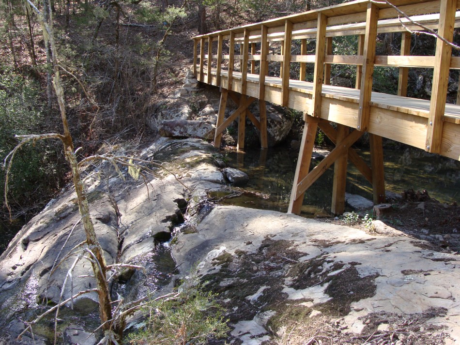 There are thirteen foot bridges between Brushy and Ed Banks, some of which are very elaborate. Others, though minor in stature, speak to the attempt to minimize erosion and the detrimental effect it would have on the water quality of the Cossatot. For the hiker it means little chance of getting your feet wet!