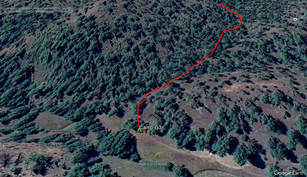 We continued west but now on the Chicken Coop Canyon Trail #29. It was 4.5 miles to the next junction, the Trotter Trail #30. This section of #29 stays on the mesa and is pretty level. It was fall and we were gifted with an area where the grass had turned red. At the Trotter, we turned right (northwest), hiked a mile and dropped a hundred feet into a nice grassy valley. This was our third camp, in Clear Creek Valley.
