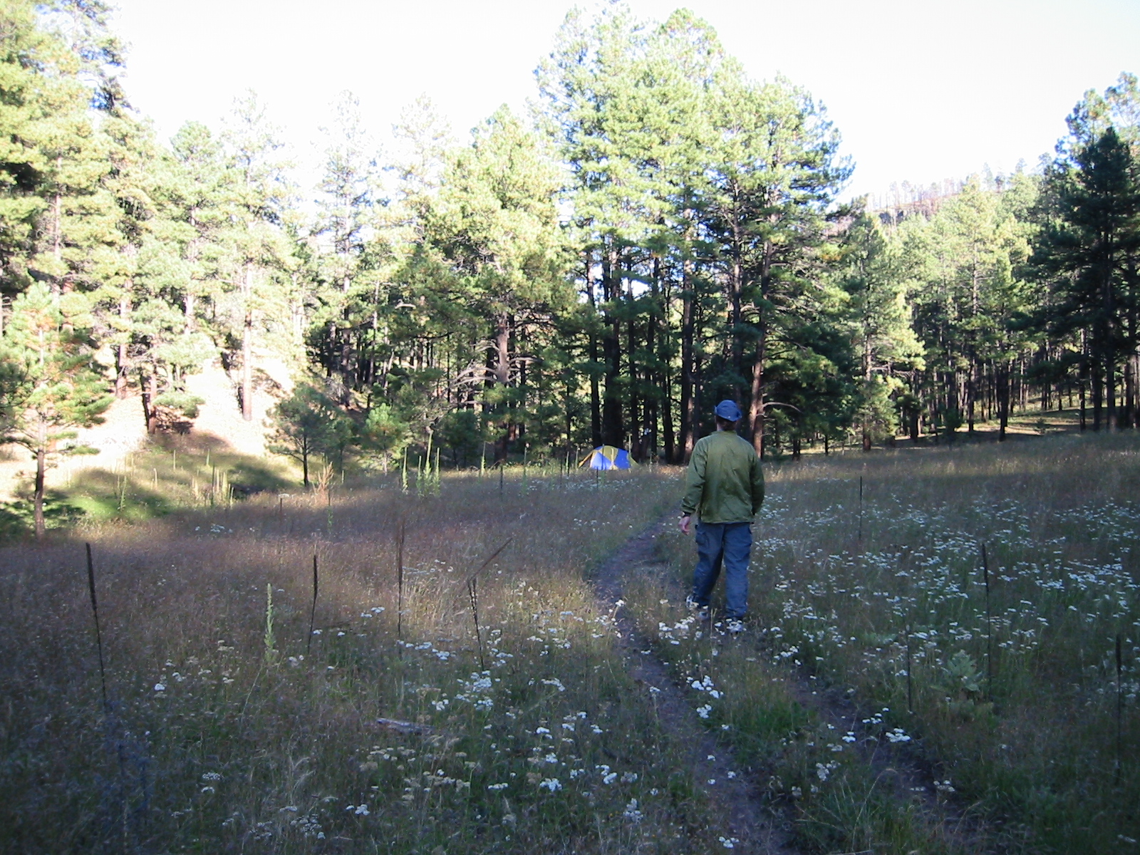 There is a great campsite in the meadow near the river. While we were there, a pack of coyotes were hanging out by the old ruins marked on the map. (Don’t get too excited about the ruins. It appears to be the remnant of an old cabin and there is very little left).When you leave this area, be sure to top off your water bottle at the river because there won’t be any water for a while. Head south for a tenth of a mile on the Middle Fork Trail (#157, which goes all the way to the Gila National Monument Visitor Center on the south side of the wilderness). Turn right (east) on the Clayton Mesa Trail #175 and start a gradual climb to Clayton Mesa. After 0.7 miles there are a half mile of switchbacks that put you on the mesa. The toal climb is 750 feet. ascent up to Clayton Mesa on Trail #175. Since the Gila National Forest Forest has always had a let-it-burn policy, the area has an open understory with grasses and pine needles covering the forest floor.