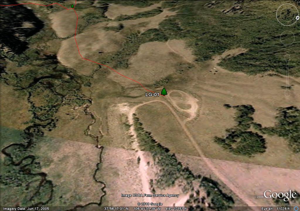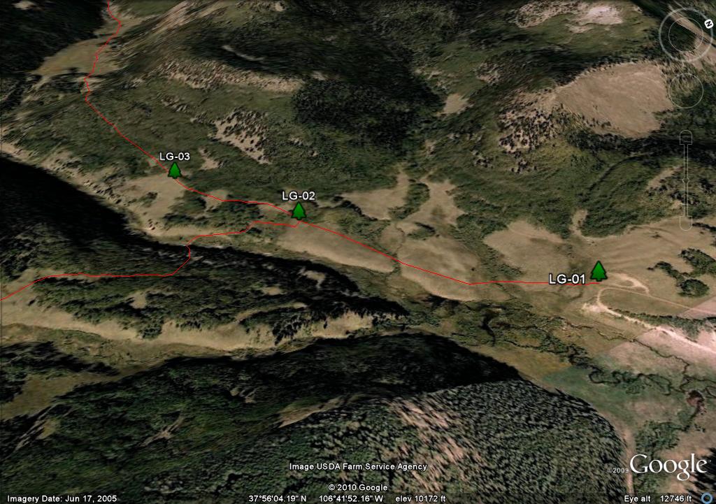 I think I marked all the posts from LG-13 to LG-30. There may be one or two between LG-12 and LG-13 I missed, and for sure, I don't have a point for the post at the edge of the mesa LG-09 and LG-12. The coordinates of these points can be extracted from the KML file. You will see some have a rusted sign that when it can still be read says Center Stock Driveway. I don't know the history of the stock trails, but this is now the La Garita Stock Driveway, and you are on the correct route.