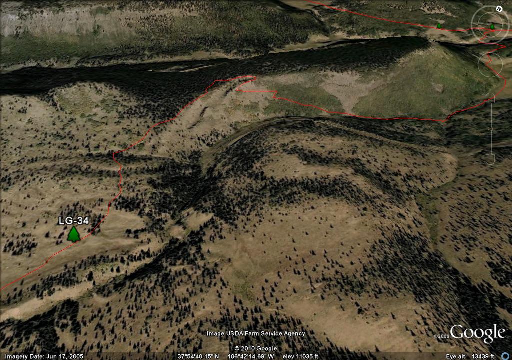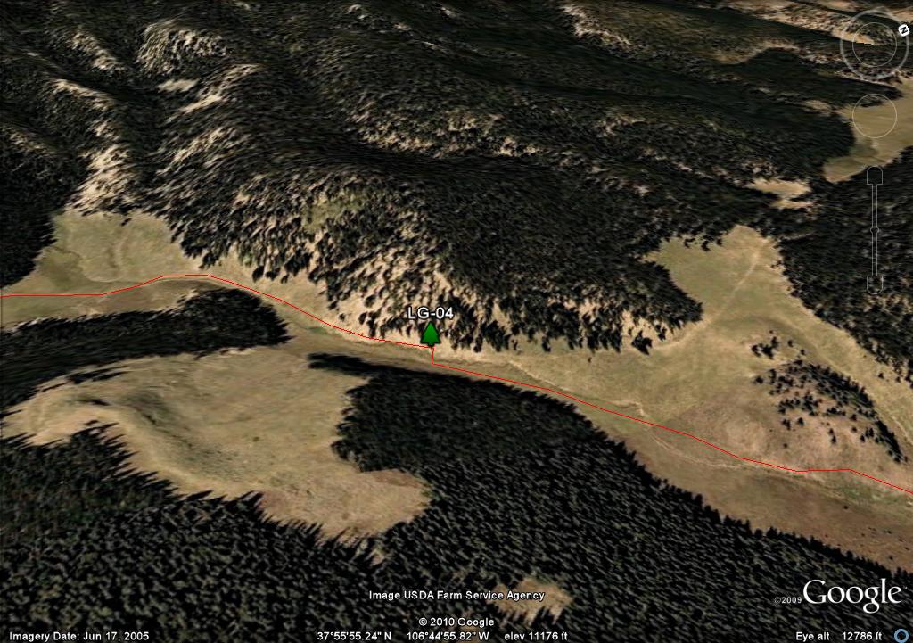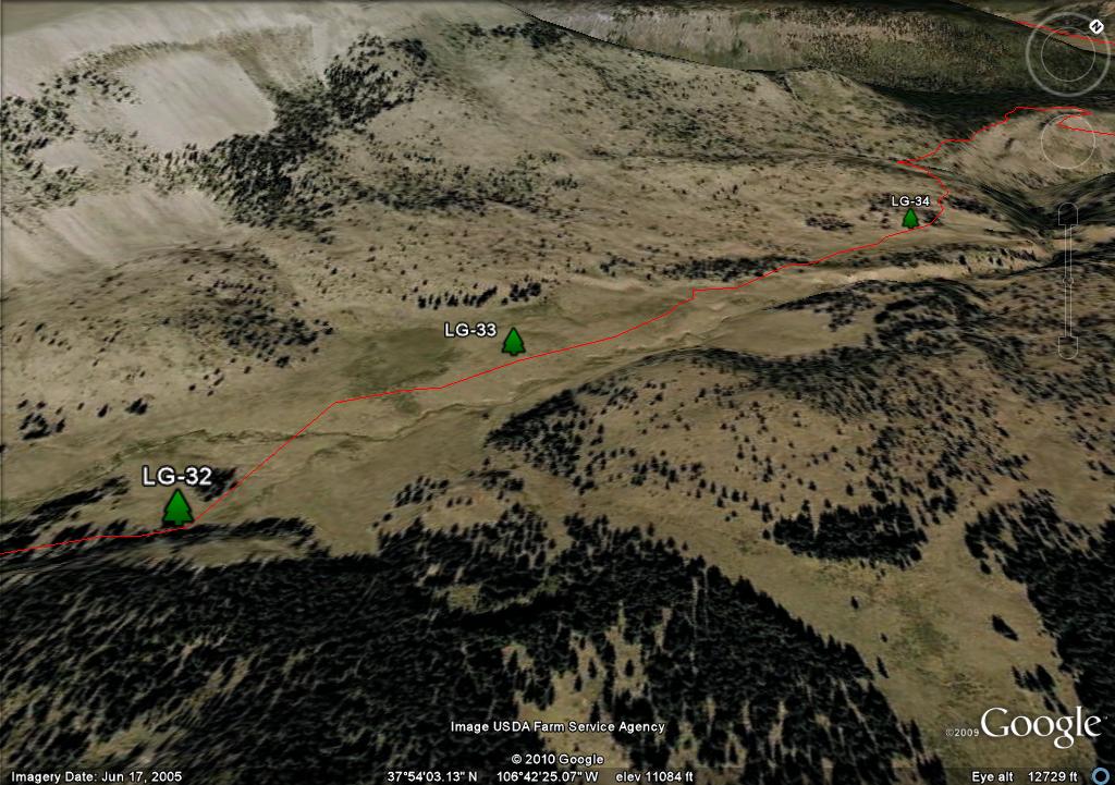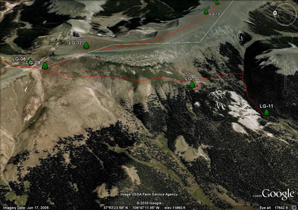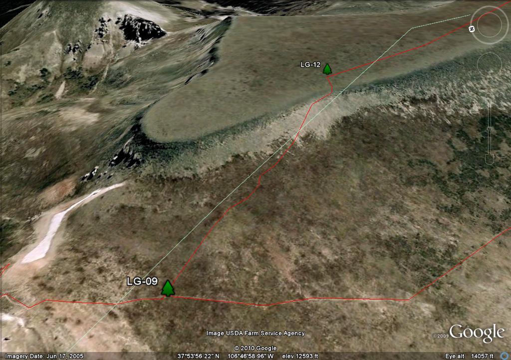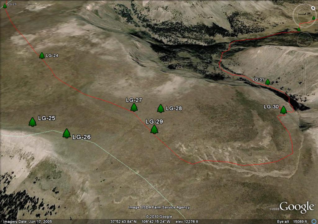 On the map you will see two waypoints on the mesa, LG-25 and LG-26. These are big rock cairn and they are further south than where you need to travel. There are three posts in a triangle, LG-27, LG-28 and LG-29. I show the trail going through LG-27 and LG-29 because it more closely follows the "official" route as defined by both the Forest Service GIS and Trails Illustrated. Since there is no real trail, in retrospect if I had the coordinates of the LG-30, I would have taken a direct route from LG-28 to LG 30.