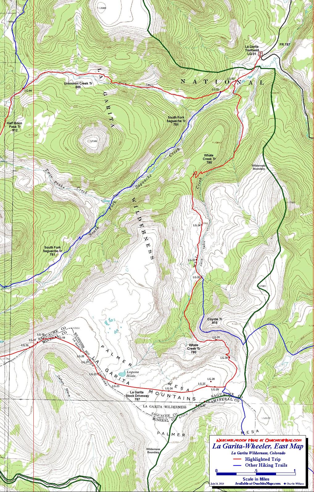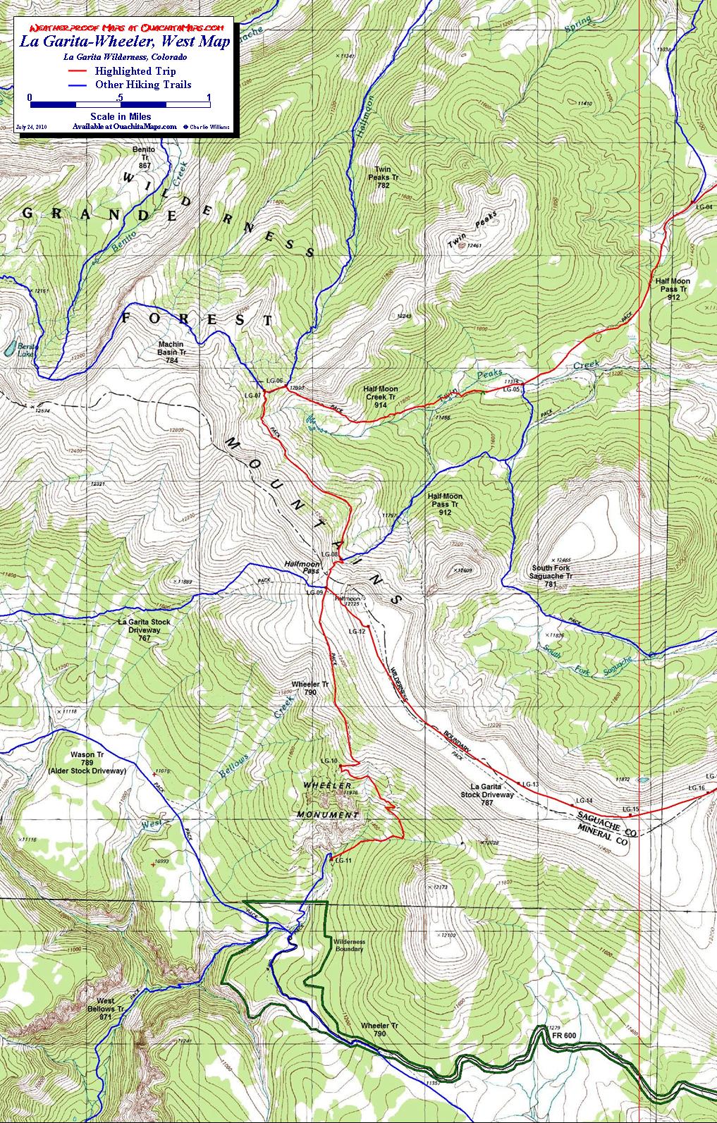 Info: USGS 7.5 minute Quadrangles: Mesa Mountain and Half Moon Pass for the hike and Wagon Wheel Gap and Pool Table Mountain for additional coverage of the southern approach to WGA and the south rim of Palmer Mesa. This entire trip is in the Rio Grande National Forest, headquartered in Monte Vista, CO, telephone: 719-852-5941. The La Garita Wilderness is administered by the Saguache Ranger District, Saguache, CO, telephone: 719-655-2547.