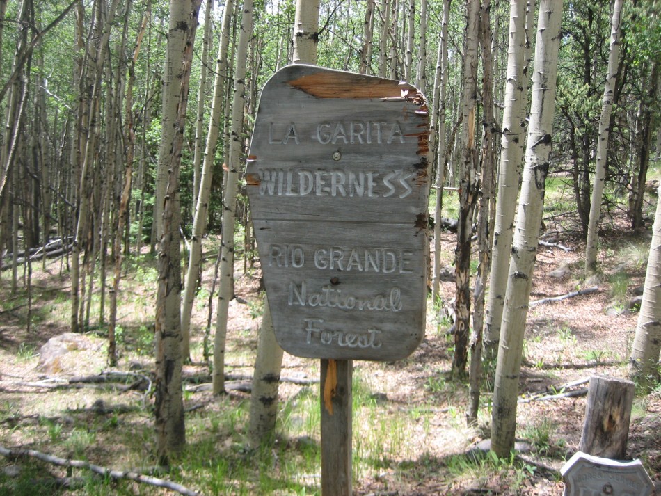 The La Garita Trailhead has a huge parking lot surrounded by a split log fence. There are no facilities. The trail takes off from the south end of the parking lot near the registration sign (LG-01). The trails are not blazed. There are marker posts along the way, mostly at trail intersection, and a few signs, but there are few indications of trail names or numbers.
