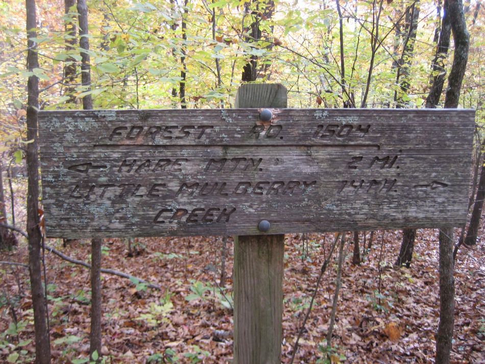 The trip to the Morgan Mountain trailhead is 1.6 miles along the ridge (video) of Morgan Mountain. The route is a gradual downhill with a few vistas. Along the way you'll pass through a small outcrop, see another rock wall and cross a minor forest road (video). When you reach FR 1505, the trail crosses the road and follows the wooded hillside. About 0.1 miles past the road is a sign and spur trail (video) to the trailhead parking lot.
