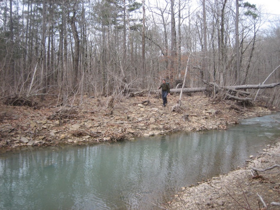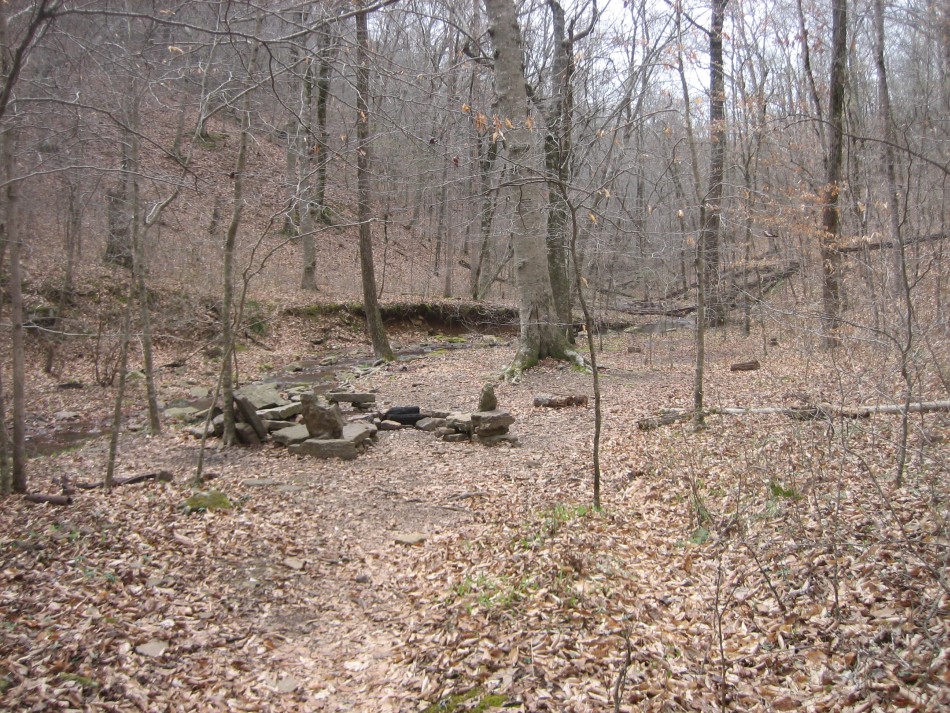 It is just shy of a mile to Indian Creek on the OHT, all down hill. When the trail reaches the valley floor you will see a large flat expanse of fairly open forest with lots of cedar and one really tall sweetgum. The main campsite is a little further down the trail near the creek and has an Arkansas fire pit and stone furniture. We opted for an LNT camp in a large open area next to a stand of river cane south of the trail on the east edge of the valley floor. However, with such a large flat area, you can find many other places to set up camp if need be.