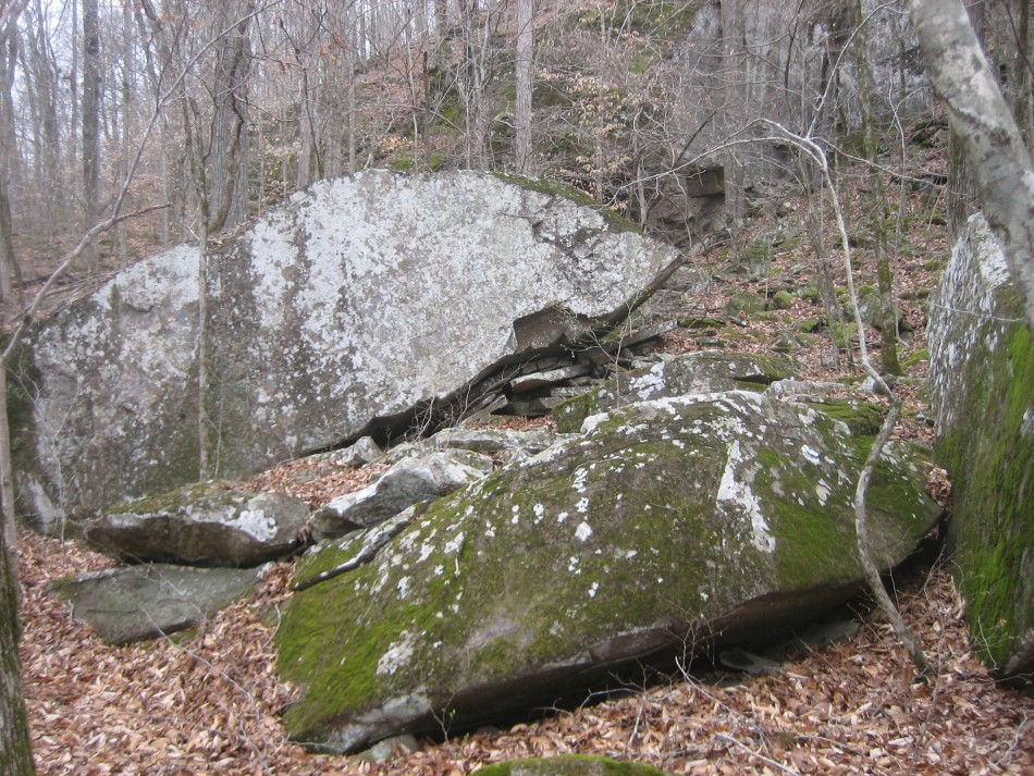 The trail enters the woods for a few hundred feet and hits another lesser forest road. To your right is a large drive-in hunter's camp. The trail takes you towards the left (east) of the camp and then peters out at the edge. Walk across the east side of the camp and you will find the trail on the other side. Once you are following the white blazes again, you will work your way around the head of Eldridge Hollow. It starts out with a small pour off and then the trail passes some car sized sandstone boulders covered with lichen and moss. Next were some bigger pour offs, culminating with a pretty hollow (video) with a water fall, overhang and plenty of water.