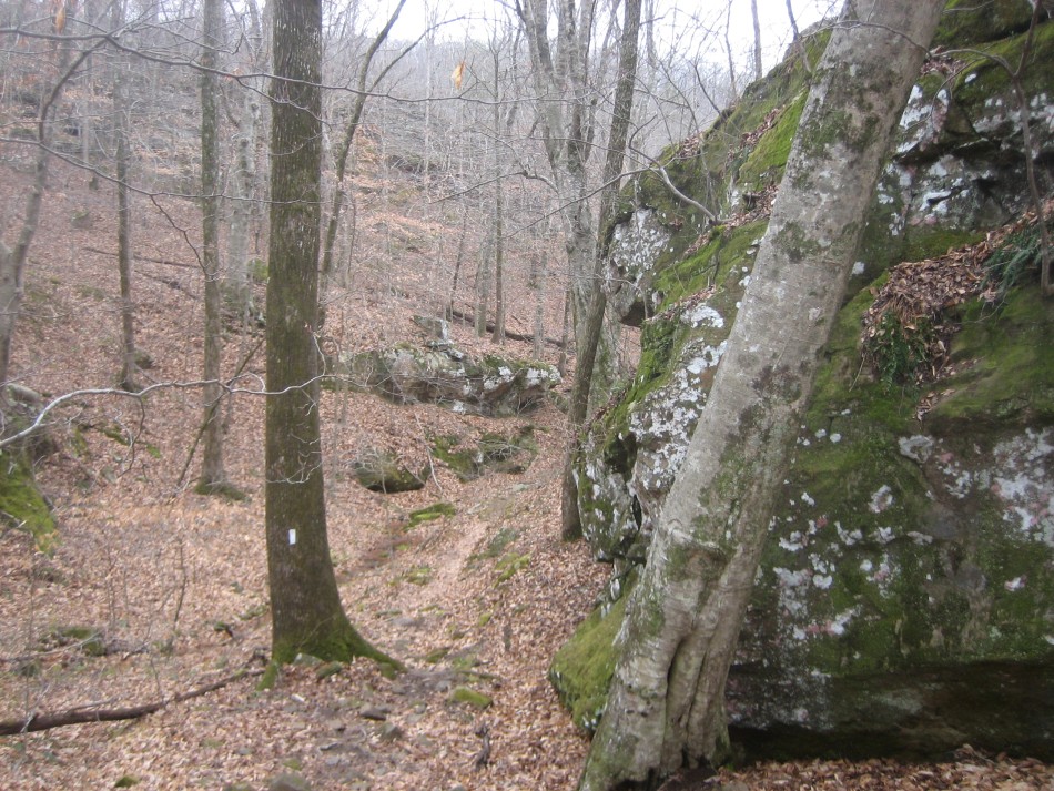 At OHT-18 turn left and cross the Little Mulberry River (video) on a concrete road bridge. No wet feet here no matter how much rain (unless that Noah guy shows up). Stay on the road for 0.3 miles and just past the pasture on the right, turn right and follow the easement. Climbing out of the bar ditch you will see a stand of river cane. Follow the narrow easement for a little over 0.1 miles until the trail enters open forest. The forest up to mile marker 57 is hardwood on a fairly gentle but rocky hillside. Past mile 57, it becomes very rocky with bluffs to your right and boulders the size of a truck. I found this area very scenic. The last part of this section is a boulder hop across Lick Branch. Cross county road 5051 (OHT-17, OHT mile 56.3, trip mile 29.3) and the Lick Branch trailhead is on the right.
