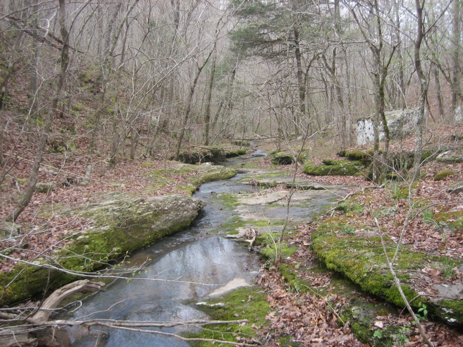 In 0.6 miles there is a campsite on the right. It is worth stopping and checking out the bluff (video). The Atoka sandstone is fairly massive here and forms some 30 foot cliffs around a small drainage. The top is mossy and there is a small chasm where a huge section has broken away from the bedrock. There is a stream about 400 feet further down the trail that should be reliable most of the year. Across the creek, the OHT heads west along the top of a ravine and passes mile marker 60. The next 2 miles is a 600 foot descent on switch backs. My favorite part was the massive moss covered outcrop at the bottom of the mountain.