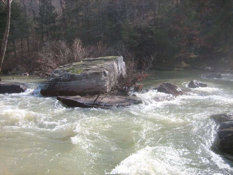 The trip from Big Piney to Ozone ia 19.9 miles. The OHT back that direction is at the back of the parking lot. There are some social trails there too, so watch for the white blazes as the trail heads due west. Head up hill crossing FR 1002 and into the woods. This is 1.2 miles to Haw Creek Falls Recreation Area. The short section is pretty, dominated by a huge rock next to the trail.