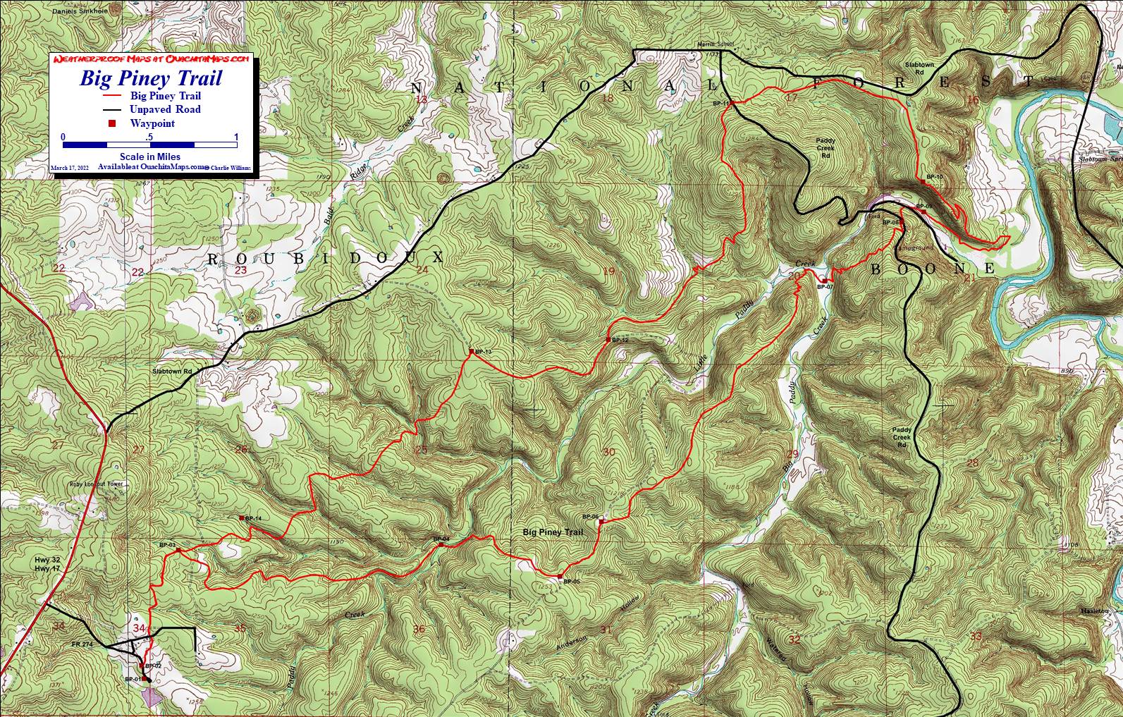 The Maps: There are two FREE maps on this page. Both are true 1:24,000 scale based on the USGS 7.5 minute quadrangles. The Paddy Creek Area Map is a much larger map showing more of the roads surronding the wilderness and is best for planning. The Big Piney Trail Map focuses on the trail. Big Piney Trail is shown in red and was taken with a GPS. The waypoint (blue) correspond to the narrative. The roads in the area have been updated using satellite imagery and are shown as black lines.