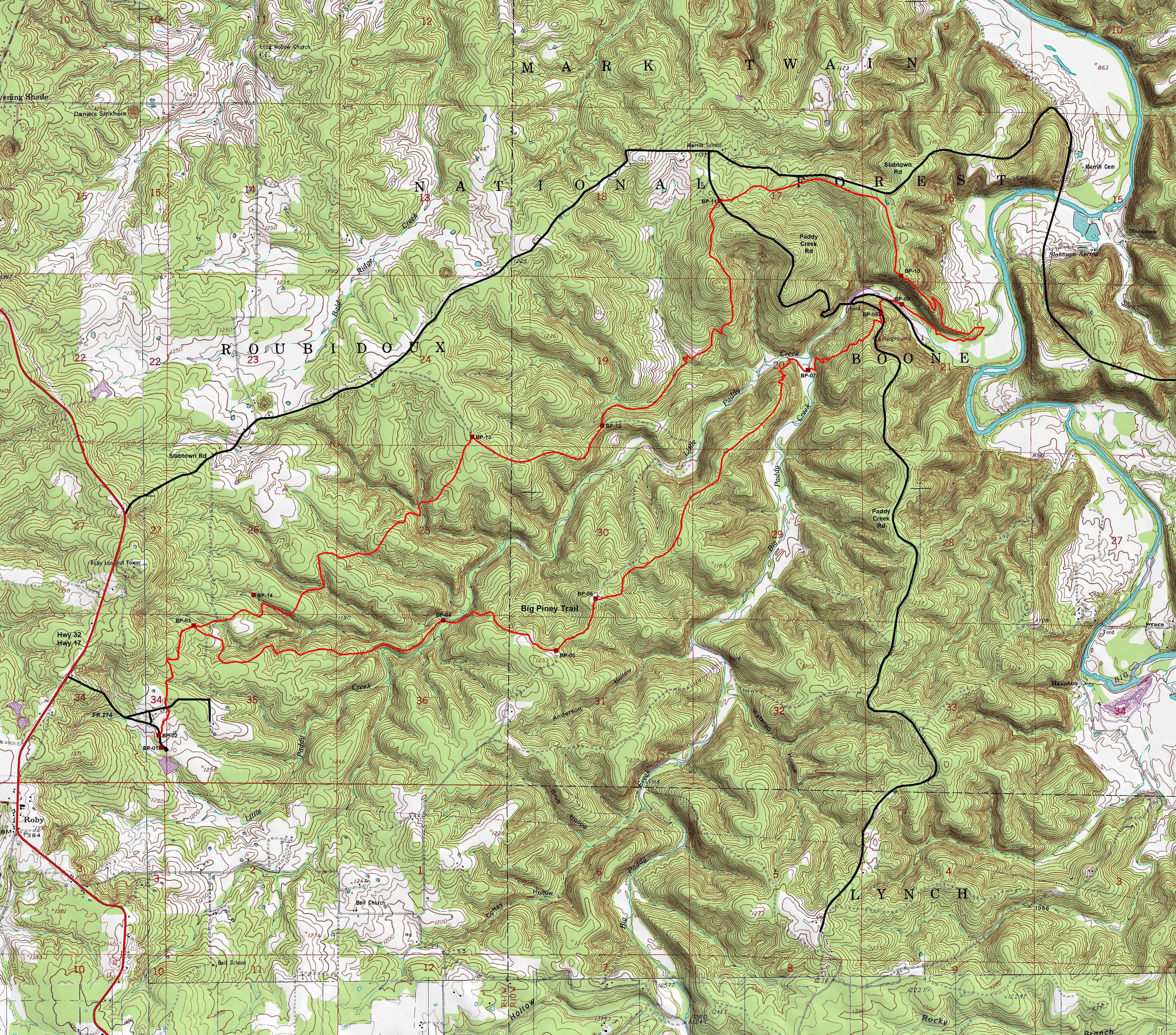 The Big Piney Trail is a 17 mile loop that cuts through the Paddy Creek Wilderness. Connecting the trailhead access at Roby Lake and the Paddy Creek Campground, the loop has a north leg and south leg that are basically separated by Little Paddy Creek. The wilderness is located 30 miles south of the I-44, between Rolla and Lebanon, making it one of the most accessible of the many Missouri hiking trails and wilderness areas.